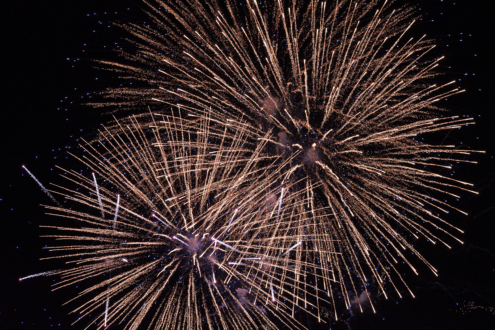 連続して打ちあがる花火を捉えた1枚です。開いた花火の直径がおおよそ構図内に収まるような画角を狙って、望遠ズームの広角側、焦点距離80mmで撮影しています。次々と開いては消えていく花火のタイミングを測りながら連写で撮影し、ちょうど2つの花火が重なり合ってきれいな円形になった瞬間の写真を選びました。