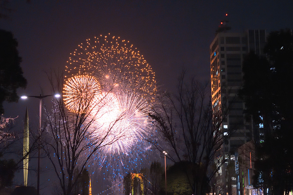 花火会場から少し離れた場所から標準レンズで撮影。標準域のレンズでは、周囲の建物なども写り込んでしまいます
