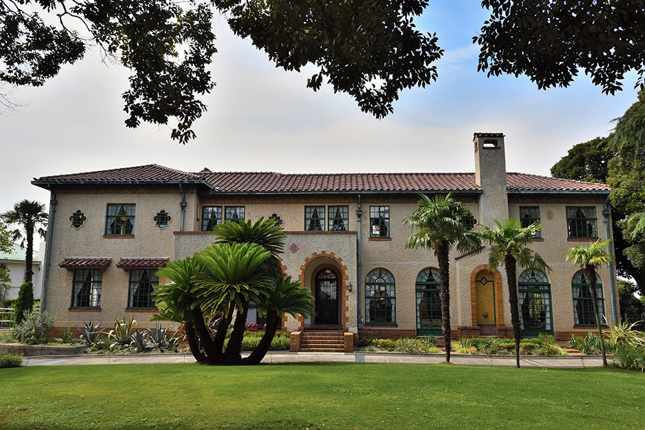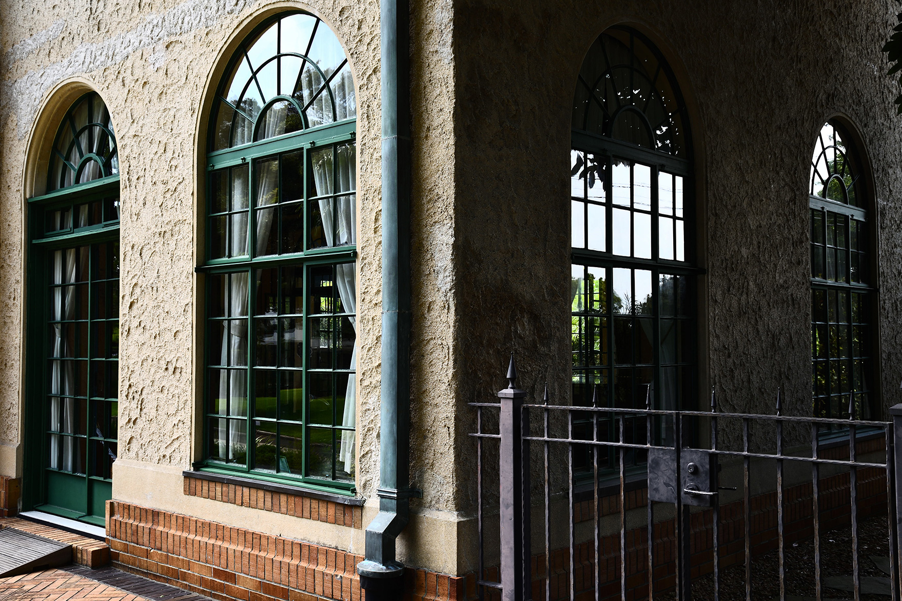 洋館に着いたらまず押さえておきたくなるのが建物の全景です。敷地の中の引いた位置から、建物全体が入るように焦点距離18mmで撮影しました。建物正面を構図の中心にしっかりと捉え、洋館全体の造りや雰囲気が伝わる1枚になりました。