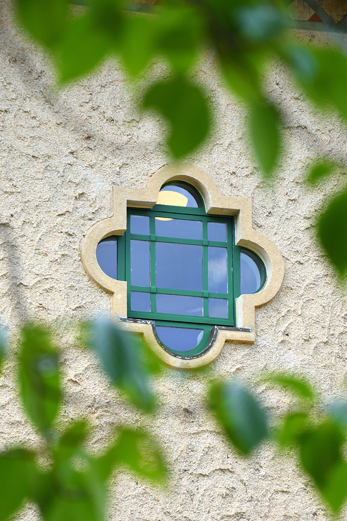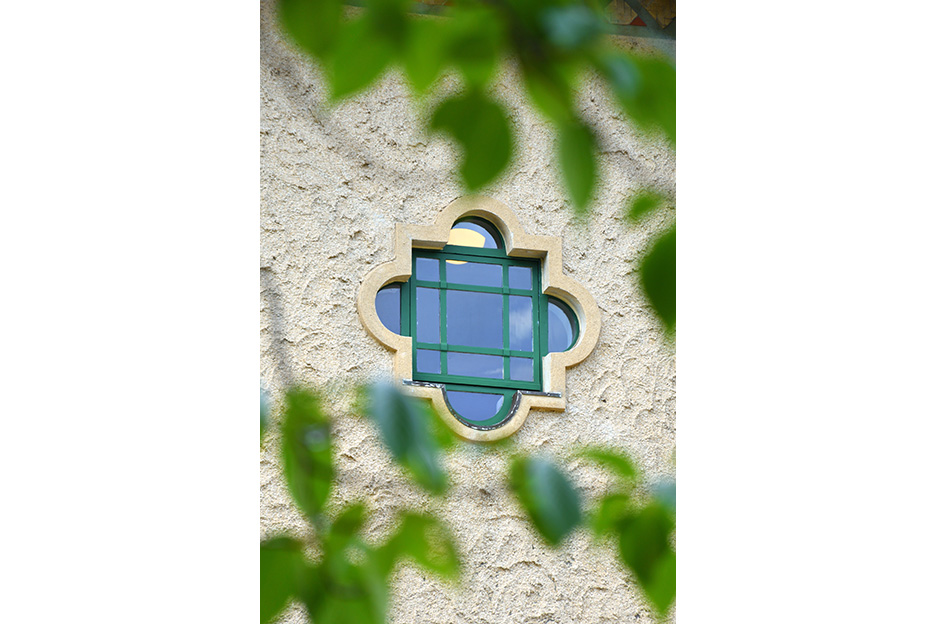 今度は建物に近づいて眺めてみると、壁面のディテールや窓の造形など洋館ならではの装飾に気づきます。そこで特に気になった特徴的な形をした窓を中心に、下から見上げるように焦点距離140mmで切り取りました。周囲にあった木の葉を前ボケにして入れ、青々とした葉が季節感を演出してくれるような画作りをしました。