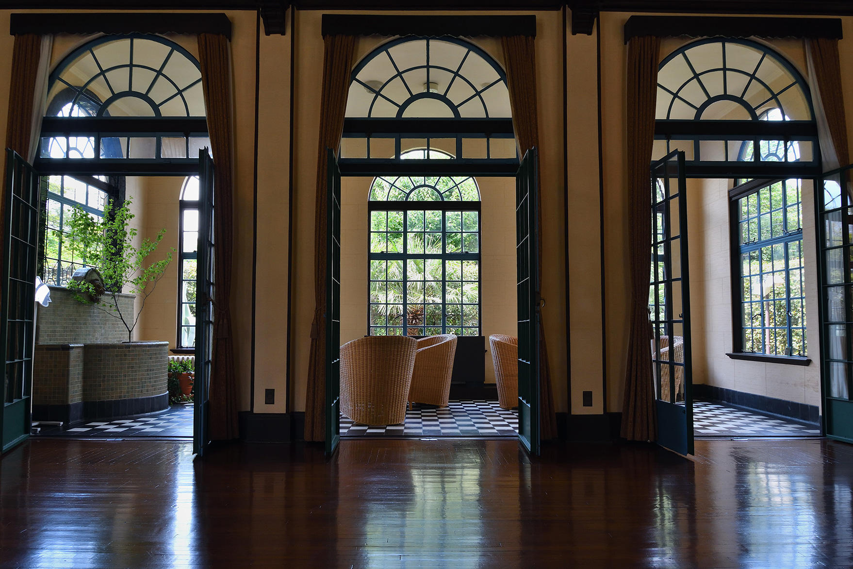 室内の撮影では、部屋の造りと日差しの状況によって窓の外が白く飛んでしまったり室内が逆光で暗く写ってしまったりすることがあります。より見た目に近いコントラストで撮りたいときには〔アクティブD-ライティング〕を効かせて撮るとよいでしょう。またこういった場所では三脚が使えない場合がほとんどですので、室内が暗い場合はISO感度を上げシャッタースピードを稼いで手ブレを防ぎましょう。※横浜山手西洋館では三脚の使用は禁止です。