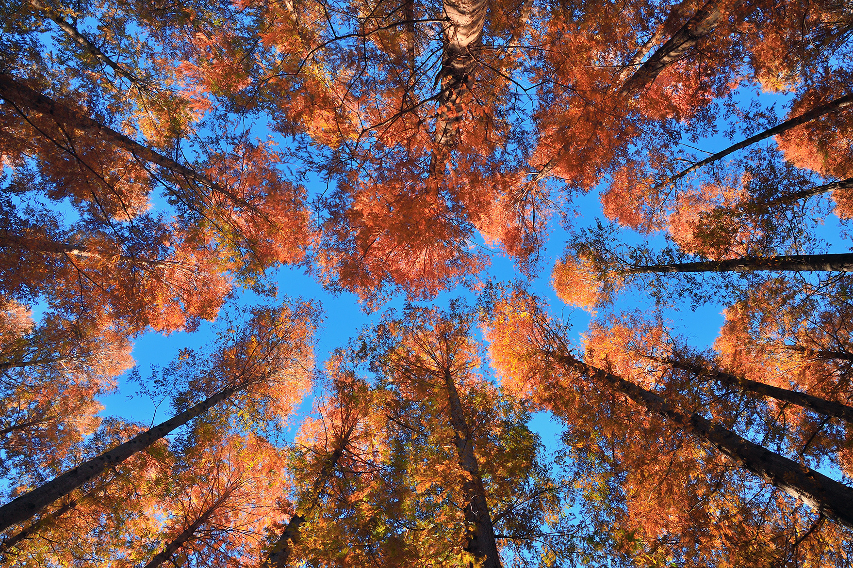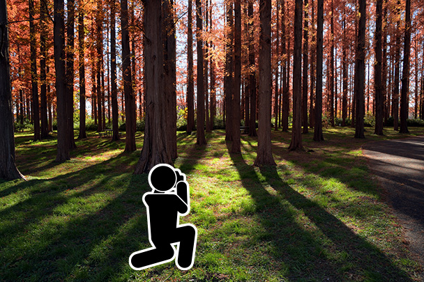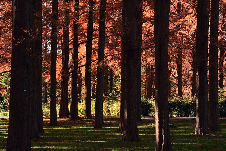 秋の午後の低い日差しが差し込む中、逆光の位置から広角側の18mmでメタセコイヤの森を撮影しました。光に透過されオレンジに輝く葉とシルエットになって浮かぶ木の幹の対比が美しい1枚となりました。少し下からあおるように構え、地面に真っ直ぐ伸びる影も入れながらフレーミング。森の広さや奥行きを感じます。