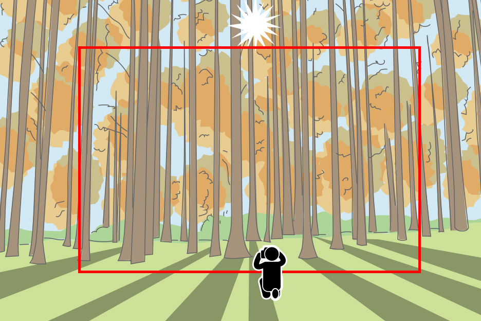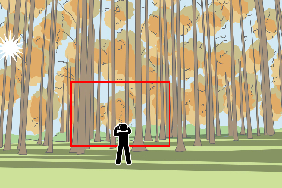森の一部分を切り取るように焦点距離85mmで、目で見た印象に近いイメージで撮影しました。横から差すサイド光を利用し、木の幹にも光があたることで先程より森に立体感が増しています。木のシルエットが縦に並んだ画面構成になっていますが、単調な縦じま模様にならないよう、木の太さや立っている位置のバランスを見てフレーミングしました。