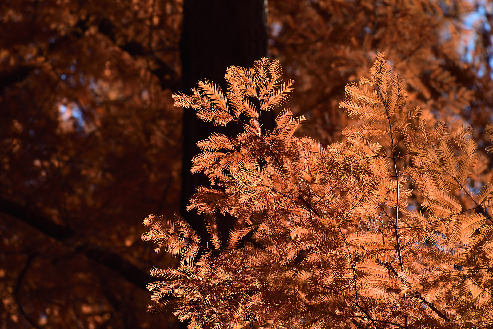 木々の隙間から差し込む光に照らされたオレンジの葉を見つけ、焦点距離300mmで切り取りました。羽根のように伸びる繊細なメタセコイヤの葉が光を透過し、美しく輝いています。暗い背景を選んで撮影することで、明暗差を活かしたドラマチックな印象の1枚に仕上げました。