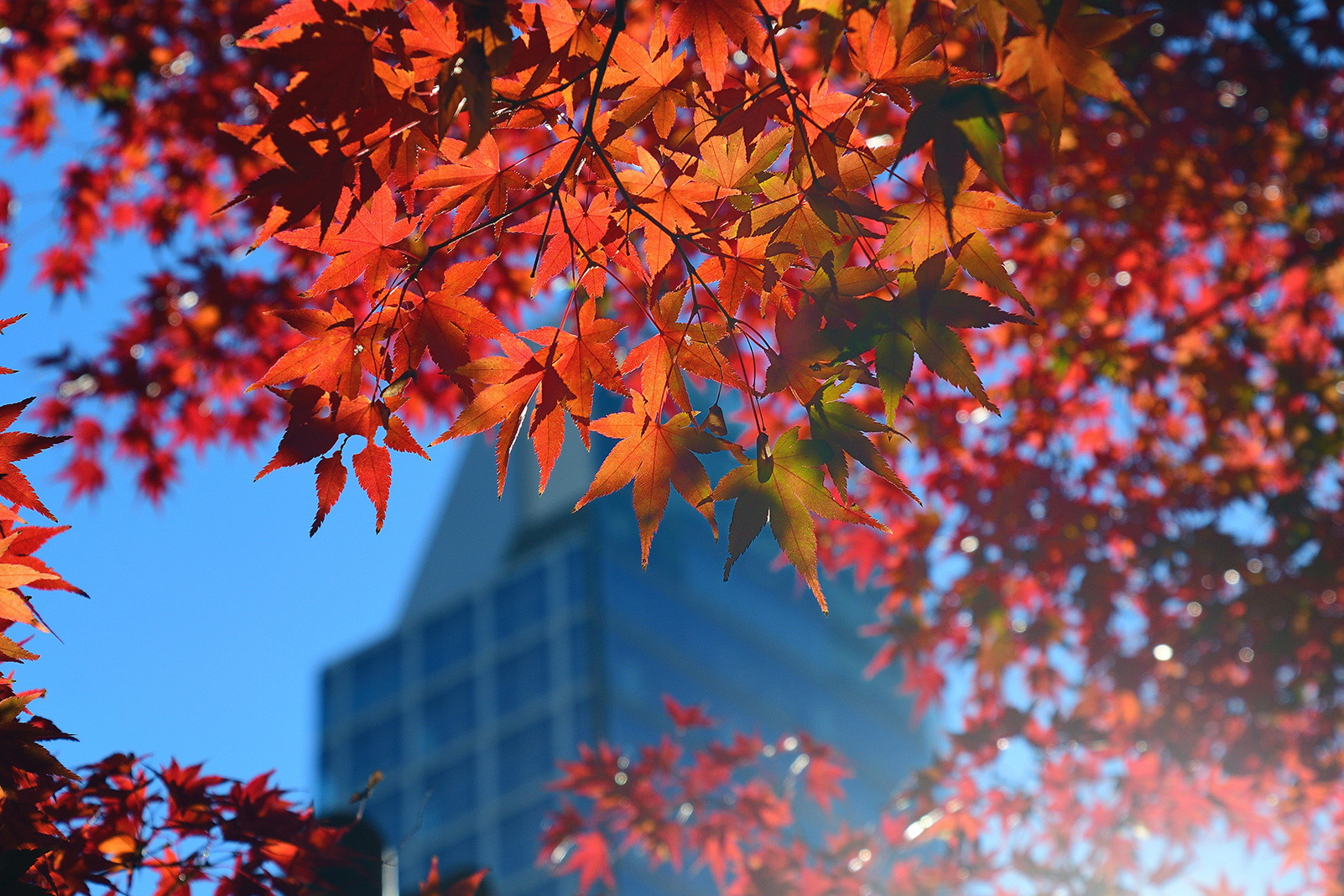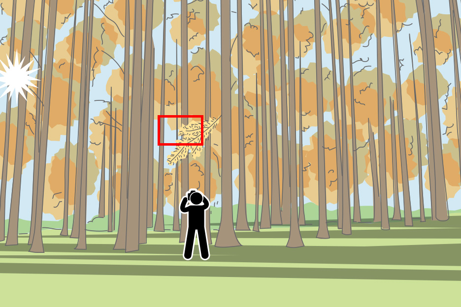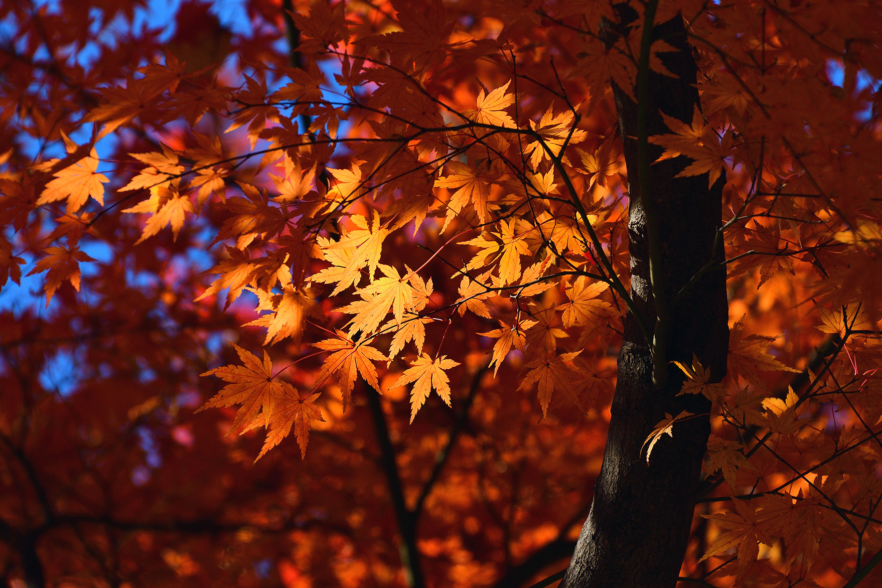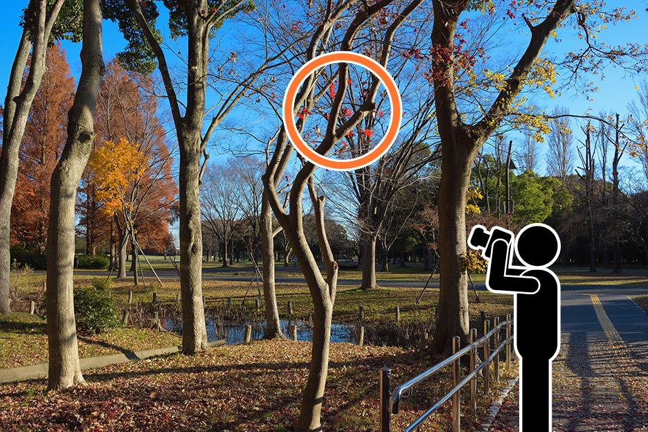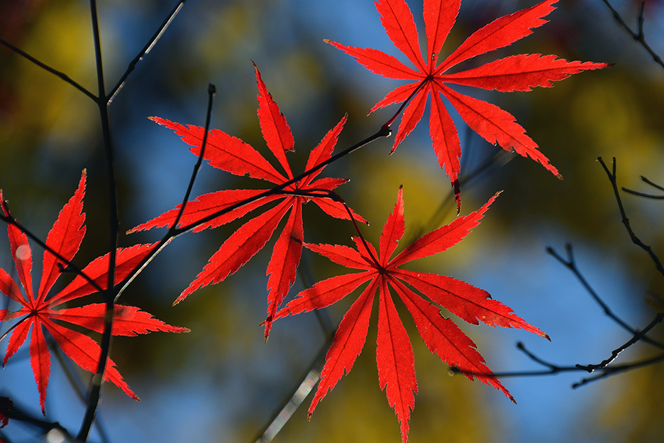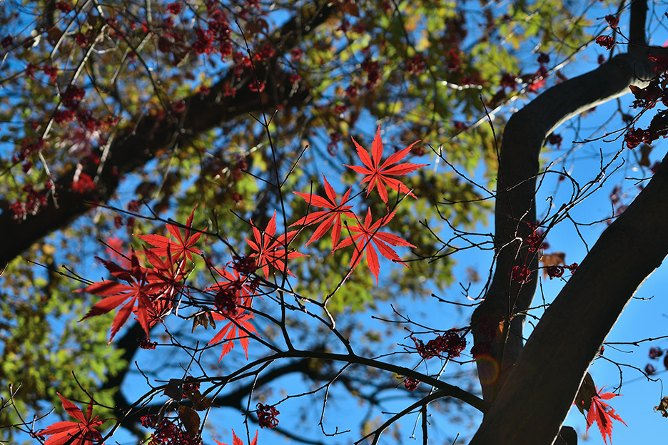 森の中や木の下から見上げるように紅葉を撮影すると逆光で葉が暗く写ってしまうため、太陽光をうまく利用しながら撮影しましょう。光が当たっている葉を選び、光を透過させることで色鮮やかに写すことができます。曇りの場合はやわらかな光で撮ることができますが、全体に暗くなりがちですので露出や[ピクチャーコントロール]で明るさや色味を調整するとよいでしょう。今回は晴天での撮影でしたが、より深みのある鮮やかな色味になるよう[ピクチャーコントロール]を[風景]に設定しています。