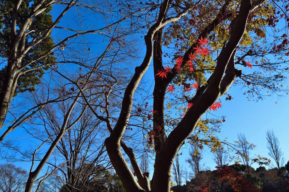 気持ちのよい青空が広がった秋晴れの日、訪れたのは高さ20~30mほどにもなるというメタセコイヤの森がある公園です。森の中だけでなく、紅葉している木々を探しながら公園の中を散策し撮影を行いました。歩いて移動しながらの撮影だったため、レンズは身軽に持ち歩け、1本で幅広い画角をカバーできる高倍率ズームをチョイス。メタセコイヤの森全体を捉えるには広角側を、葉の一部分に寄った写真を撮るには望遠側と、さまざまに画角を変化させながら鮮やかに色づく紅葉を切り取りました。