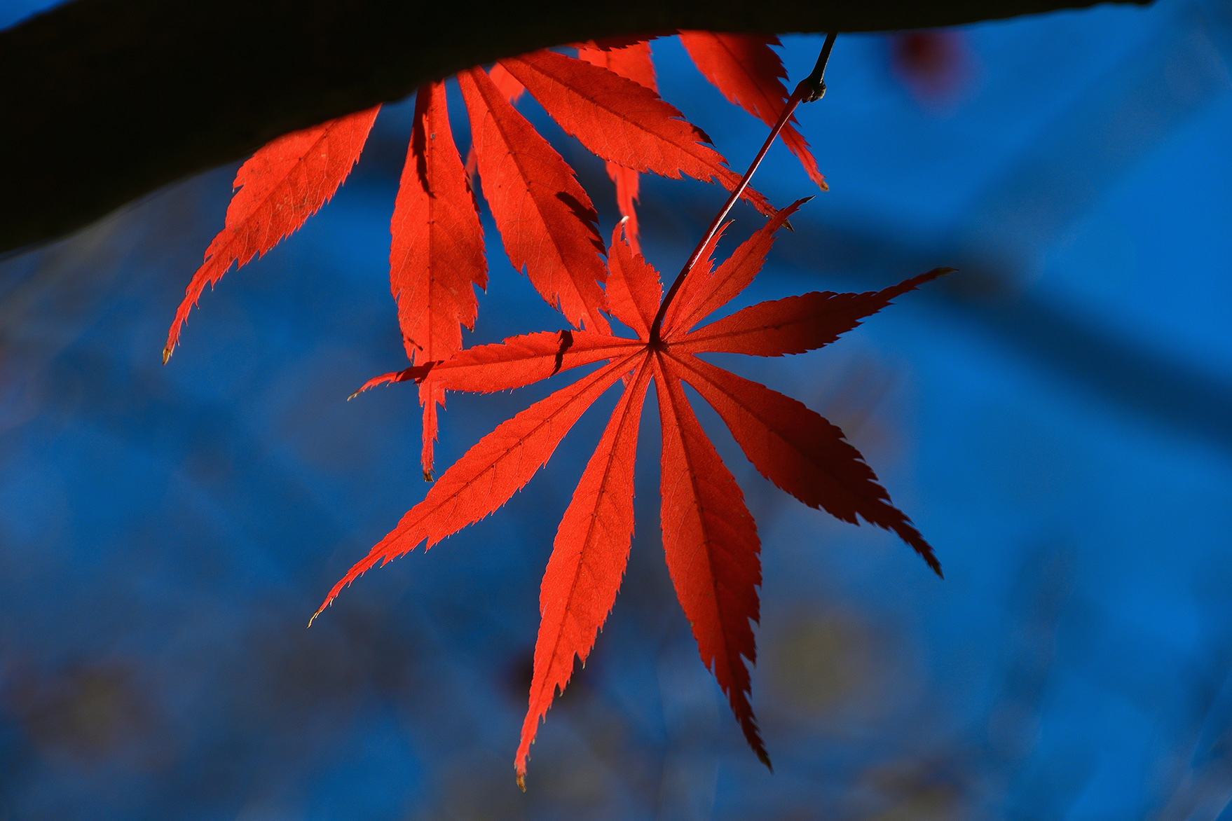 紅葉を撮影していると、美しく色づいた葉に寄って撮りたいと思うシチュエーションに度々出会います。ですが標準域のレンズしか持っていけない場合、せっかく美しく色づく葉を見つけても、木の上についた葉には大きく寄ることができず思い通りの画づくりができないことがあります。今回は高倍率ズームを持っていったため望遠側の焦点距離300mmで葉を大きく捉え、繊細なもみじの葉の形まで伝わる1枚を撮ることができました。高倍率ズームに限らず、紅葉の撮影の際には望遠域をカバーするレンズを持っていくことをおすすめします。
