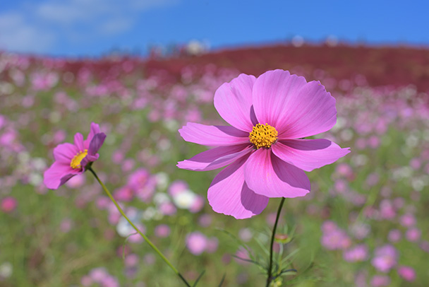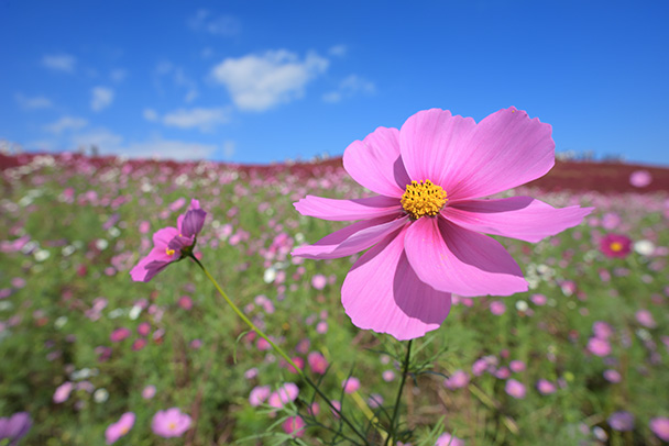 ちょうど満開を迎えたコスモス畑。短い最短撮影距離を活かし、一輪の花にぐっと寄って撮影しました。クローズアップ撮影により背景の青空と花畑の広々とした風景はぼかして表現されたため、メインの花がより引き立ってみえます。さわやかな秋空の下、気持ちよさそうに咲くコスモスの姿が印象的な1枚になりました。