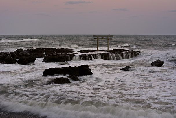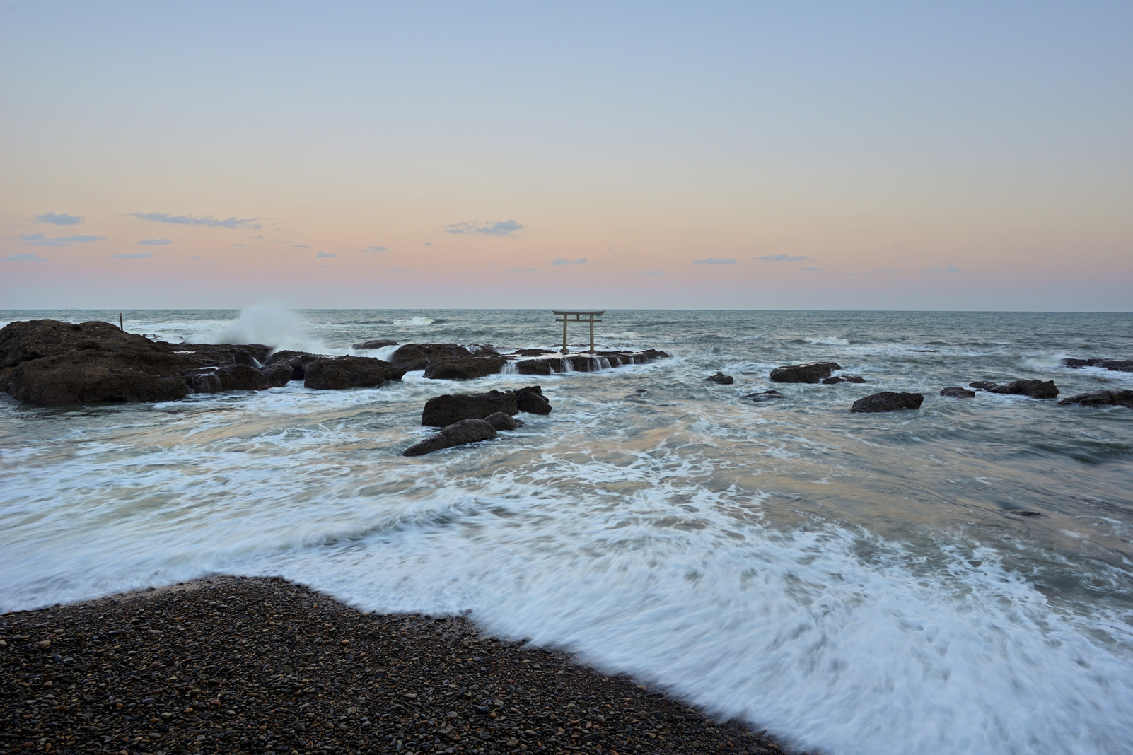 目の前に広がる風景を目で見ている以上に広く捉えることができる超広角の画角を活かしながら、海の風景を撮影しました。海岸に建つ鳥居を構図のポイントに、海岸線と押し寄せる波の一瞬の表情を切り取っています。広がりある風景写真からは、後で見返したときにそのときの思い出がよみがえるような、まるでその場に立っているかのような臨場感が伝わります。