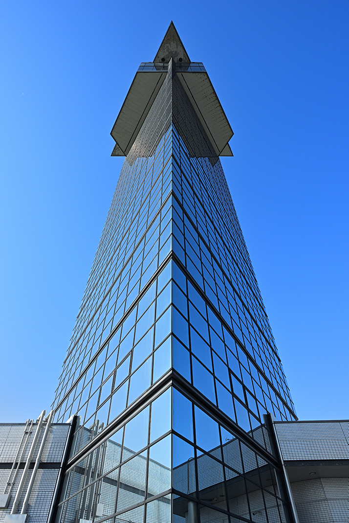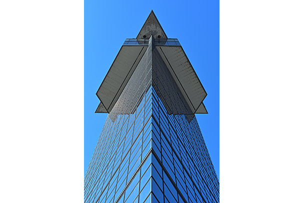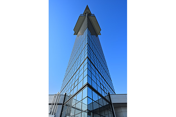 観光地に建つ高さ60mの展望タワー。近くから見上げるように撮影することで、タワーの下から上までを広く捉えるとともに遠近感(パースペクティブ)効果により高さがより強調されたダイナミックなイメージに仕上がりました。全面ガラス張りのタワーが真っ青な空の中にぐんと突き出す様子は迫力満点。左右対称の構図でより力強い印象の1枚になりました。