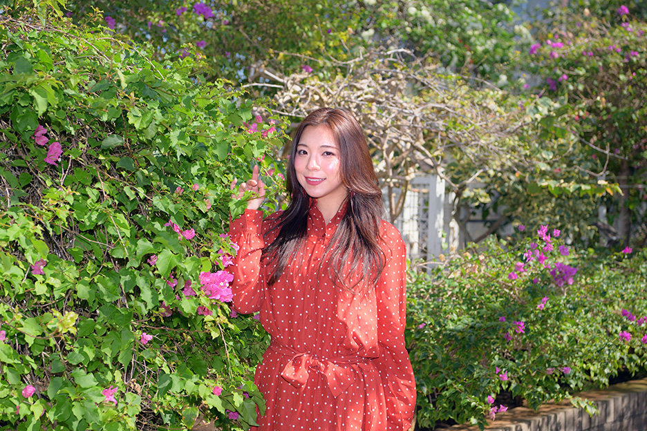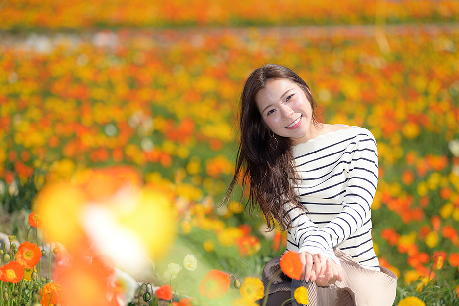 モデルの手前に花が来るような位置から絞り開放で撮影しています。絞り値を小さくしたことでピントの合う範囲がモデルの座っている付近のみになっています。モデルの足元の花ははっきりと写っていますが、手前の花はふんわりとした色のボケになり、背景もきれいにボケて被写体が引き立ちました。