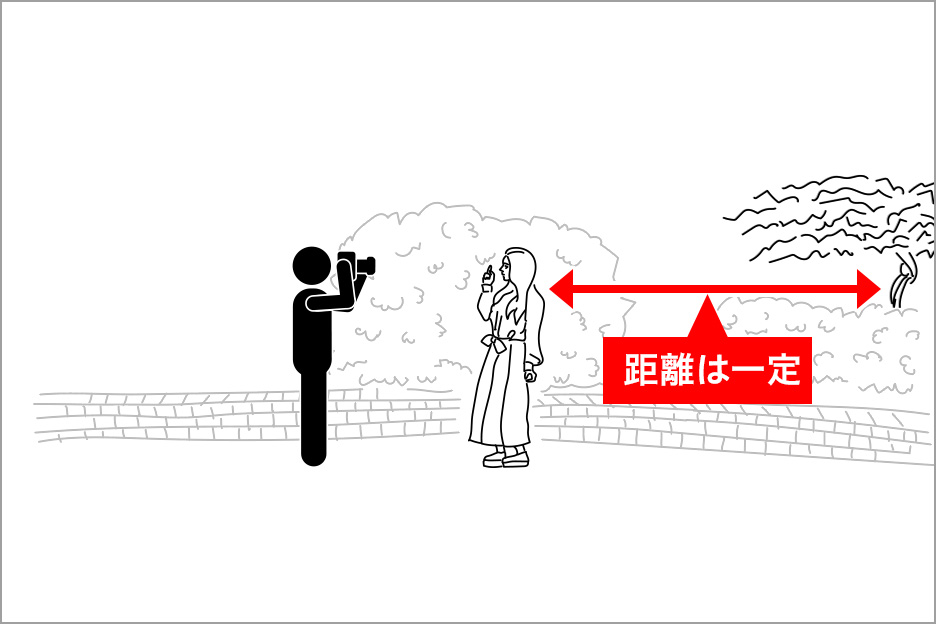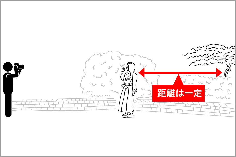 3つめのポイントは、「カメラー被写体」の距離です。この距離の取りかたによってボケかたが変わってきます。