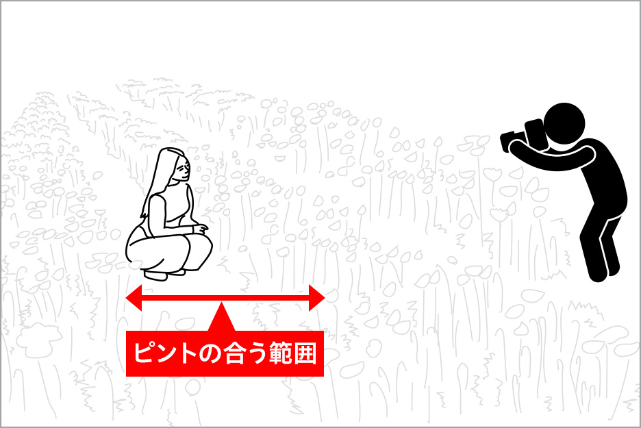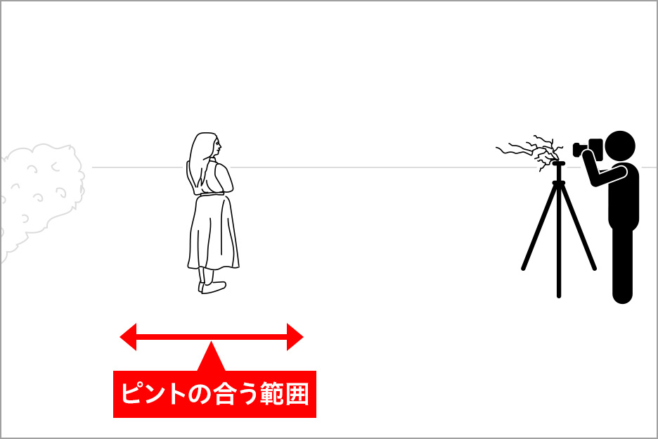 絞り値が小さいほどピントの合う範囲が狭く大きくボケる写真に、逆に絞り値が大きいほどピントの合う範囲が広くシャープな写真になります。このピントが合っている範囲を「被写界深度」と言います。手前にも生じるボケを「前ボケ」と言い、背景のボケと同じように前ボケも絞り値が小さくなるほど顕著になります。
