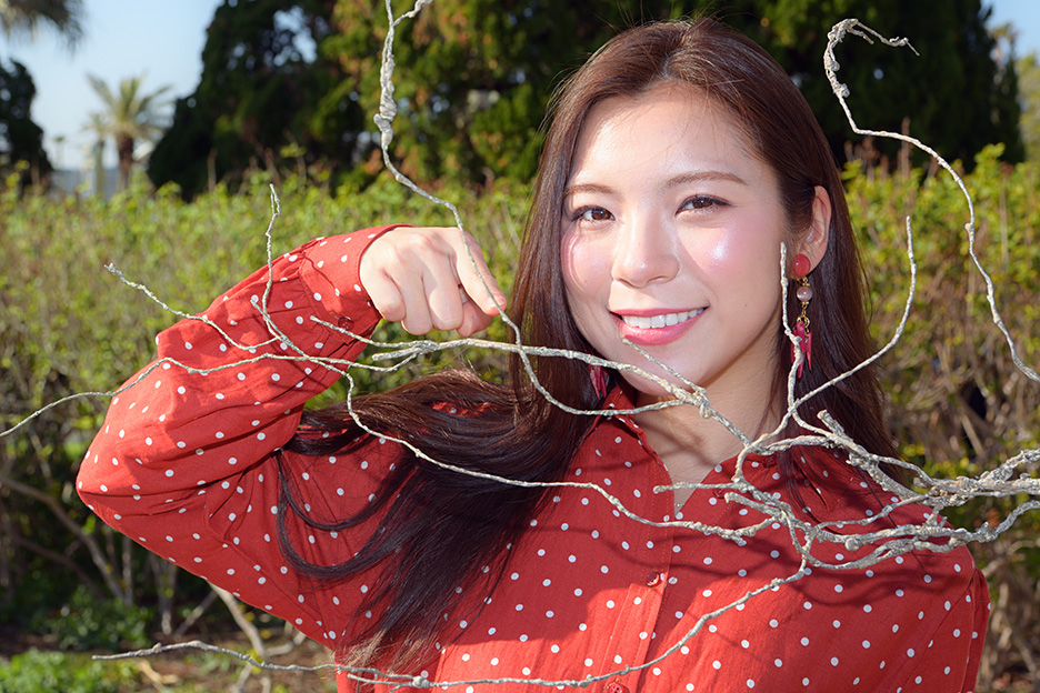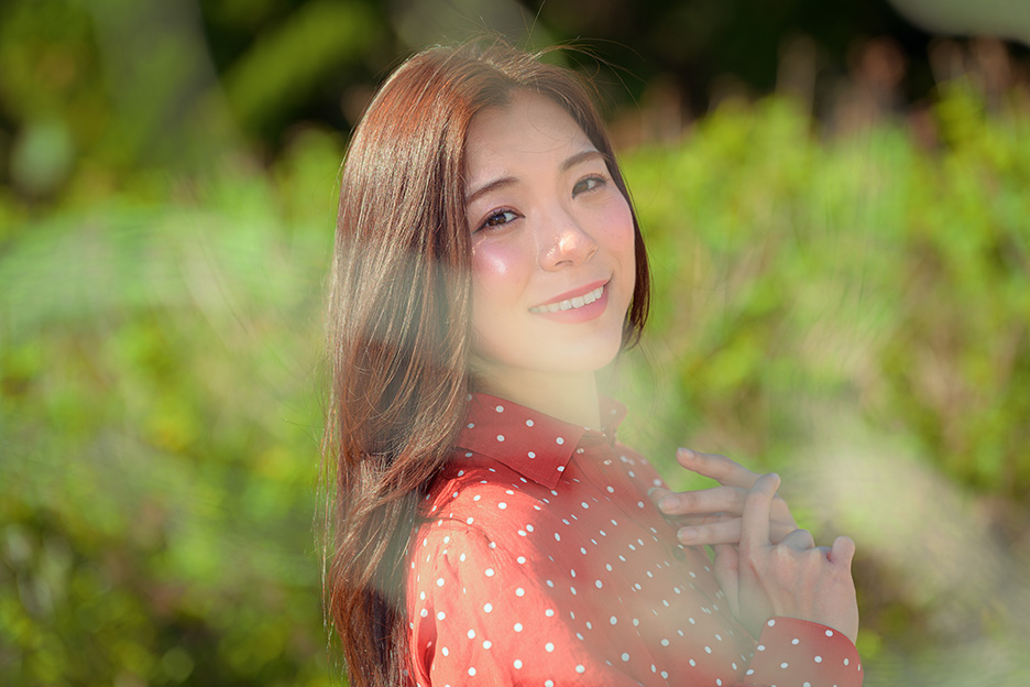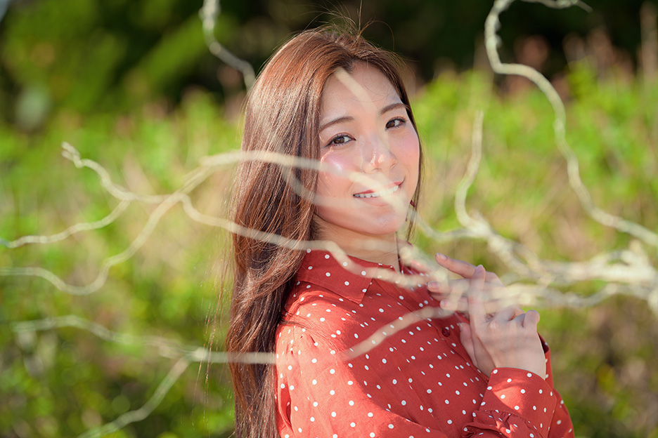 ここで実験です。カメラの前に枝を配置してモデルを撮影します。ボケ感をコントロールする4つのポイントを応用して、この枝を消してみましょう。