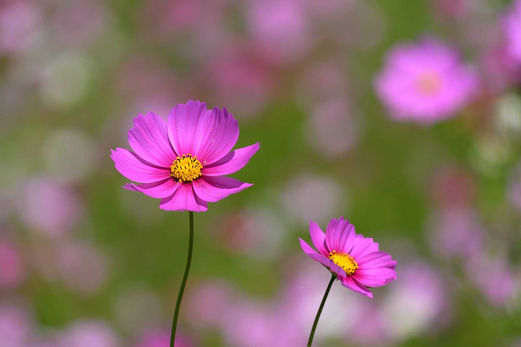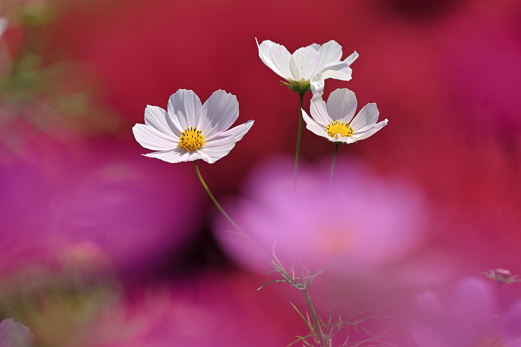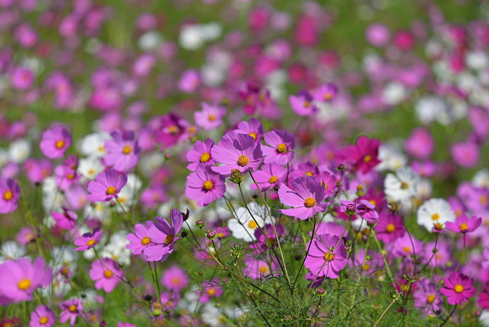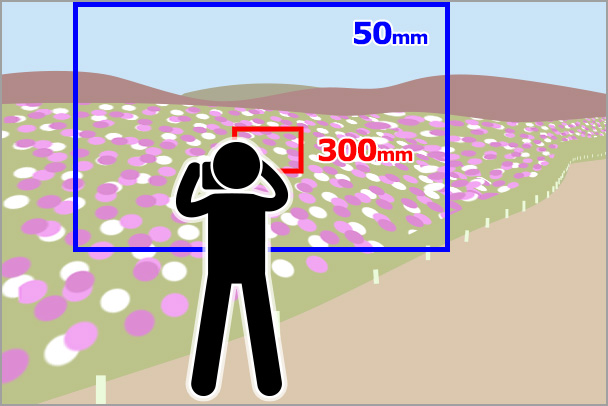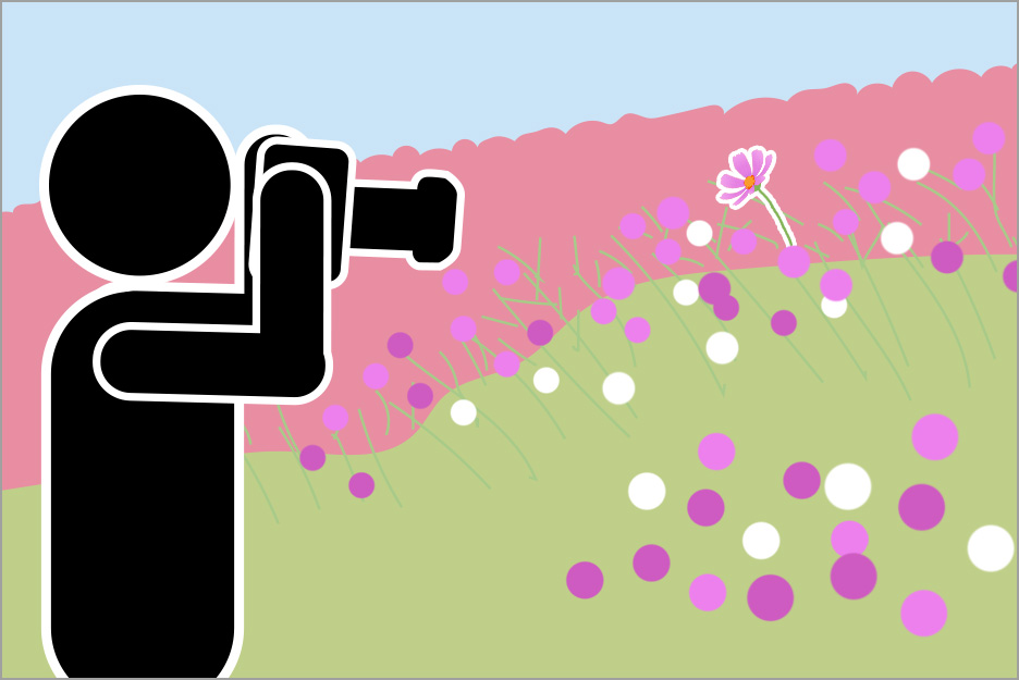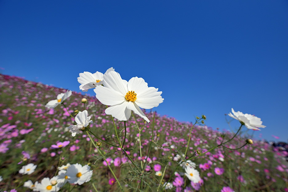 望遠ズームを使い、広いコスモス畑の一部分を焦点距離300mmで切り取るように撮影しました。圧縮効果で花の密集度が上がるため、咲きそろう前などまばらな印象の花畑でもより華やかになりました。さらに花の密集度を上げるには少し低いアングルから撮影するとよいでしょう。焦点距離が長くなるほど背景が大きくボケるため花畑のふんわりとした雰囲気も演出できます。また狭い画角は人の映り込みを避けてフレーミングしたい場合などにも便利です。