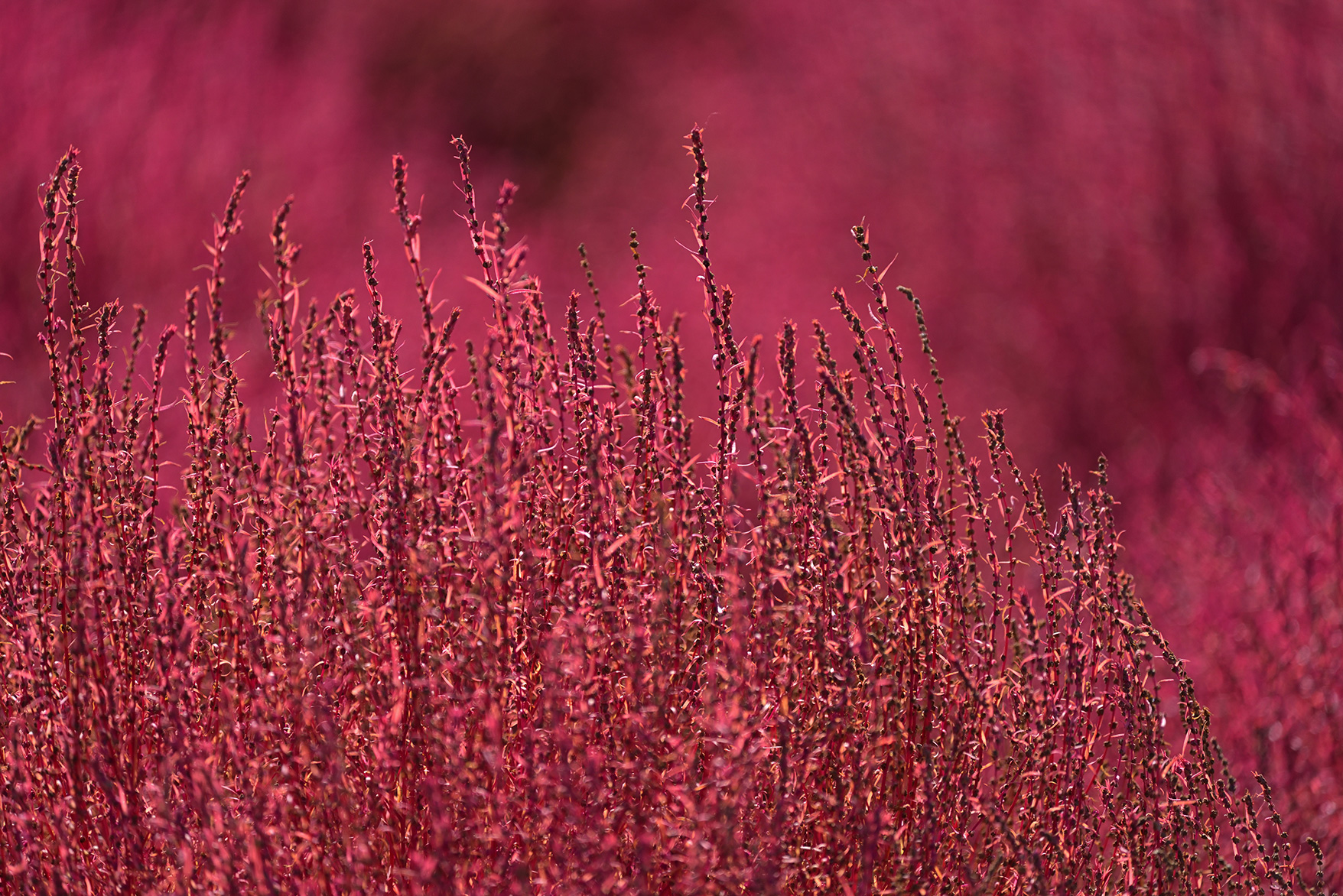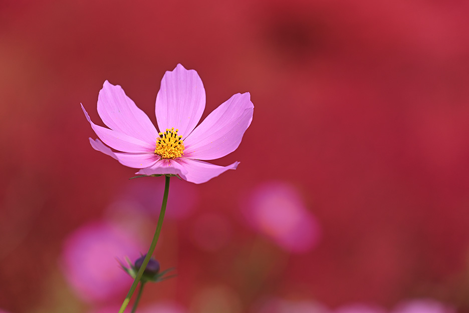 撮影場所から少し離れた位置に、一輪だけ長く伸びた形のよいコスモスを見つけました。そこでピントを合わせた被写体の前景や後景が大きくボケるという望遠レンズの特性を活かしながら、そのコスモスをアップで撮影。ちょうど赤いコキアが背景になっていたため、色のコントラストで主役をより際立たせた印象的な1枚を撮ることができました。花をアップで撮影する場合にもただ漠然と切り取るのではなく、どの花を主役にしてどう撮りたいのか、被写体となる花を探しながらアイデアを練ってみてください。