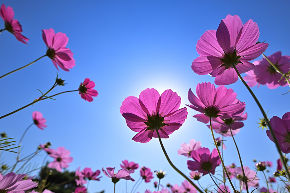 パースの効果は画面の端から中心へと向かって収束するように写るという特長も。コスモスを下からあおって写してみると、周囲の花が中心に向かってグンと伸びていくようなドラマチックな仕上がりになりました。 ※太陽が画面に入るような撮影は目やカメラへの影響をさけるため、ファインダーではなく必ずライブビューを使い、短時間で撮影をするようにしましょう。