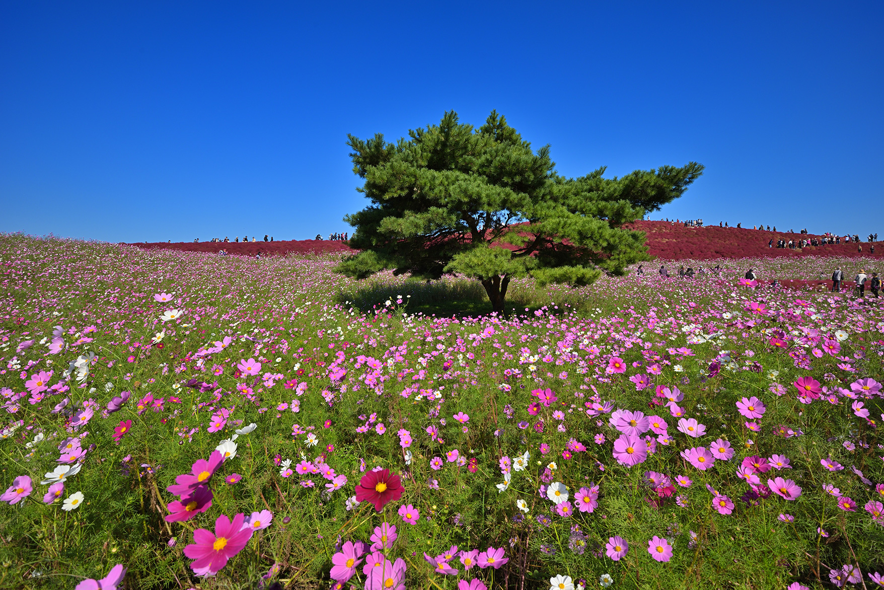 焦点距離16mmで、風景全体にピントが合うよう絞りはf/11まで絞って撮影しました。目線に近い高さから撮影、超広角の画角はその場の広さを伝えるだけでなくまるでそこに立っているかのような臨場感を感じさせてくれます。標準画角の50mmで撮影したものと比べても、超広角のレンズはかなり広い範囲を写せていることがわかります。抜けるような青空と真っ赤なコキアの丘のコントラストも美しい、さわやかな秋の1枚になりました。なおこのような引きの画を狙うなら、観光客が少ないオープン直後に撮るのがおすすめです。