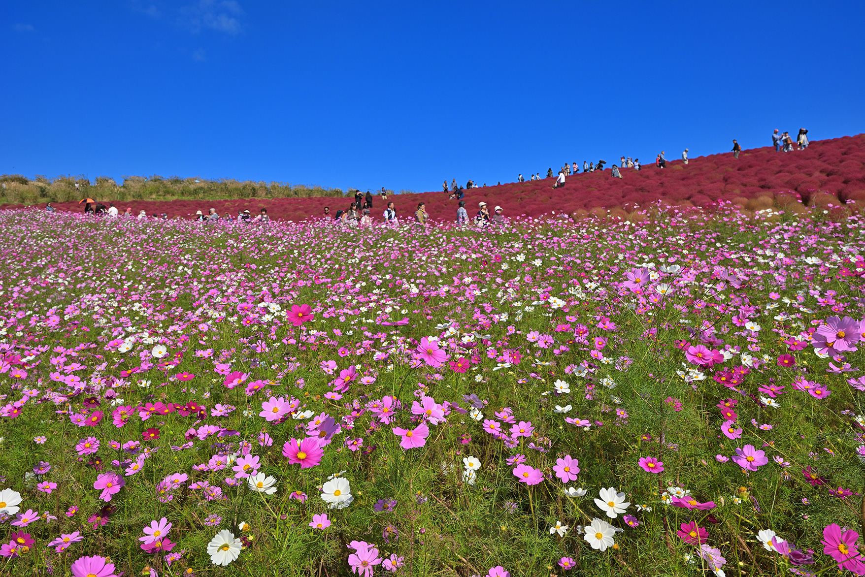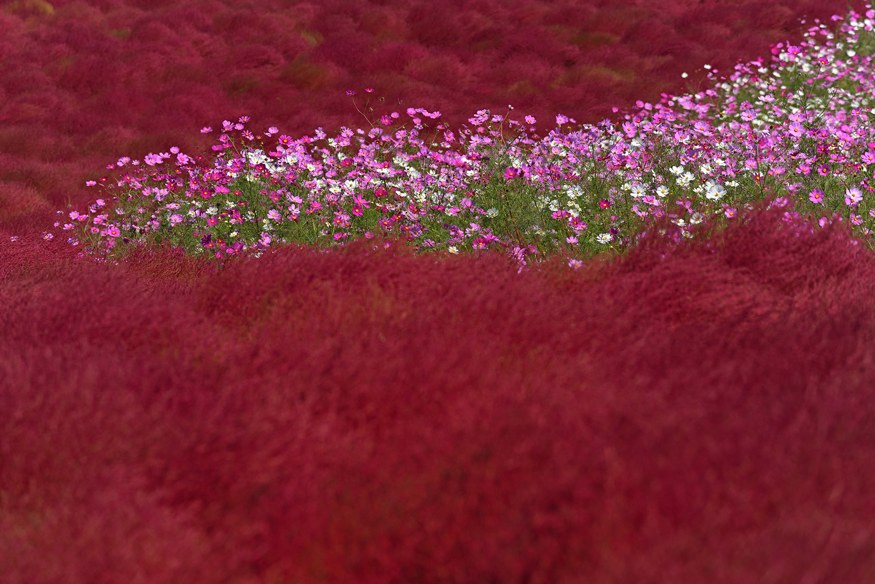 秋を代表する花、コスモスと真っ赤に紅葉するコキアが広がる絶景に出会える観光スポットにやってきました。持ってきたのはより広域を写し込める広角ズームと、大きなボケ味や圧縮効果など多彩な撮影表現が楽しめる望遠ズームです。広大な花畑を移動しながらの撮影、また多くの観光客が訪れるスポットとあって、あまり大荷物にならないよう手持ちでも撮影可能な携行性に優れたレンズを選びました。
