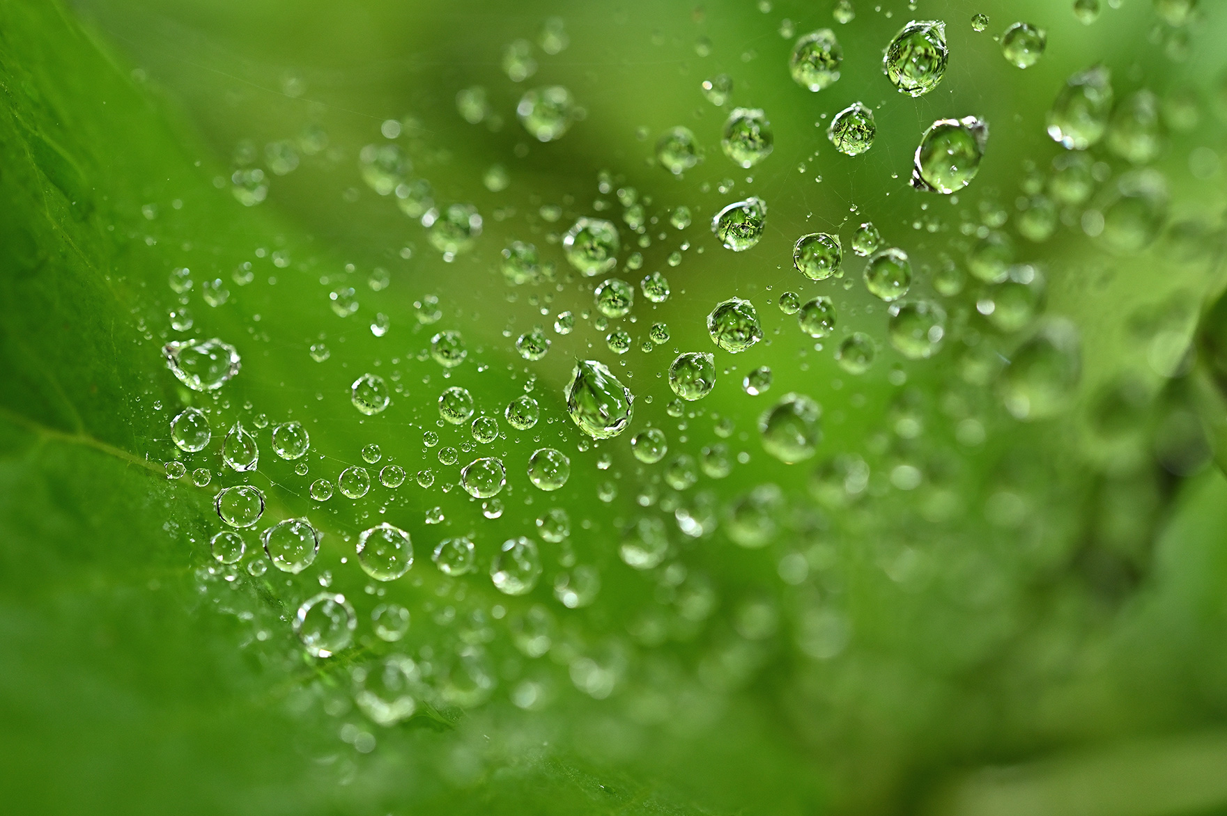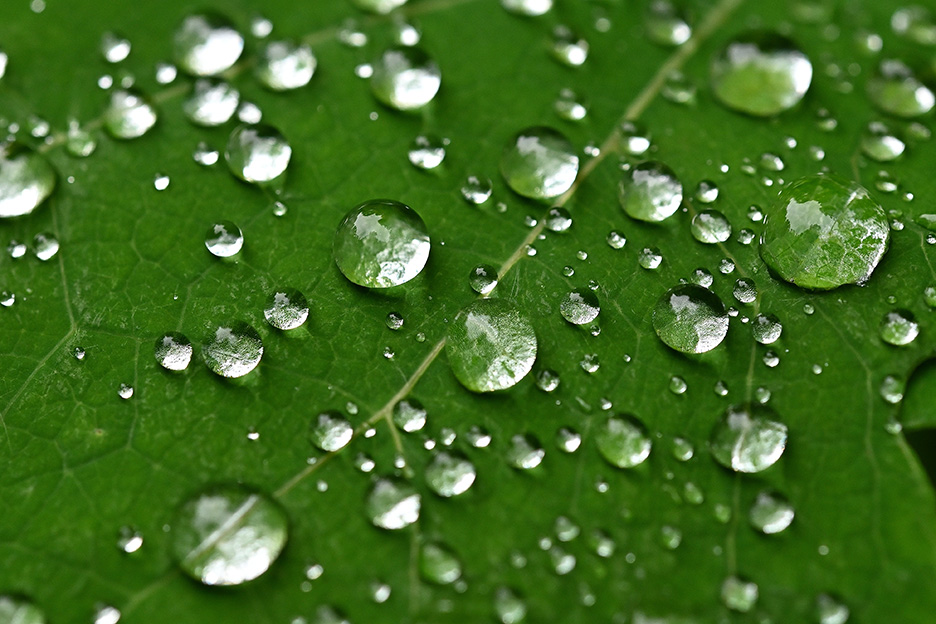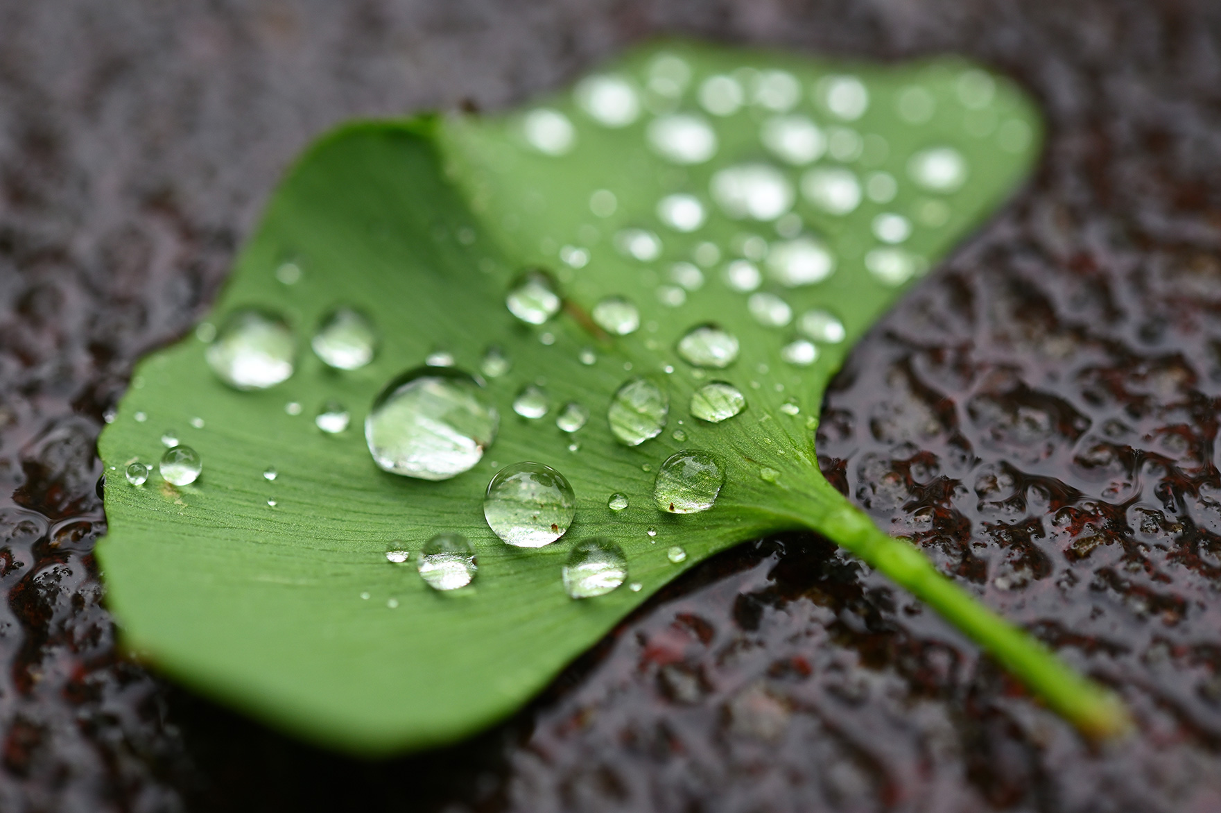 上から覗き込むように撮るためレンズ面に雨がかかるのを避けやすい被写体ではありますが、暗くなりがちですので手ブレには注意が必要です。今回はISO感度を800まで上げ、シャッタースピードを1/400秒まで確保。雨粒の表面に映りこむ影さえも見えるほど大きく、繊細に捉えることができました。