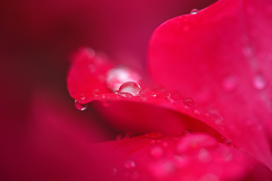 マイクロレンズで雨のしずくをクローズアップ撮影。今度は絞り(周囲のボケ具合)を意識して撮影を行いました。1枚目はある程度絞り込むことでしずくの立体感をしっかりと見せ、リアリティーある描写にしています。2枚目は絞りを開放気味にして花についたしずくの一部分にピントを合わせ、ふんわりと幻想的なイメージで撮影しました。