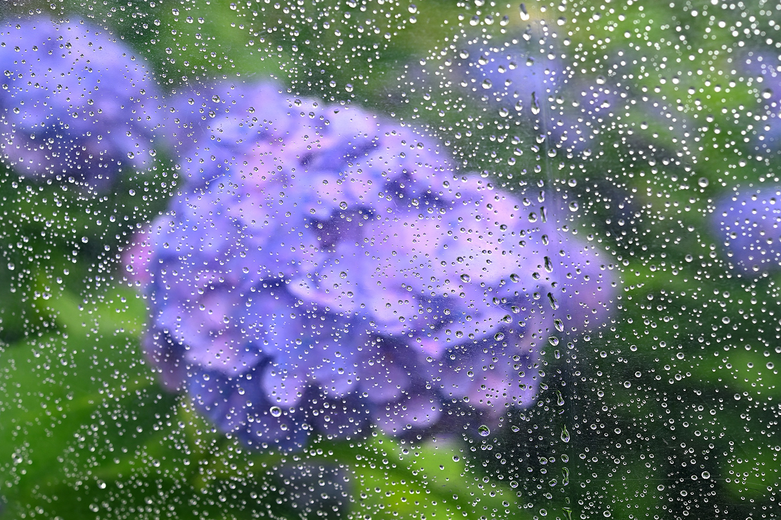 2枚目は、持っていた透明のビニール傘を撮影の小道具として使用。傘に付いたしずく越しにカメラを構えると、窓の内側から撮影したかのような不思議な雰囲気で撮ることができます。色味のあるアジサイを背景に、しずくにピントを合わせた1枚です。