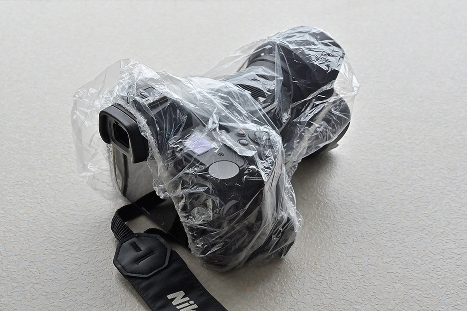 レインカバーを持っていくほどでもないけれど雨が心配な日や撮影中の急な雨のときに役立つアイテムとして、シャワーキャップがおすすめです。持ち歩くときは全体を覆うようにかぶせ、撮影時は先端を花形フードの先端に引っ掛け(丸形フードの場合はテープで止める)、モニター側はファインダーを避けるようにしておくとよいでしょう。