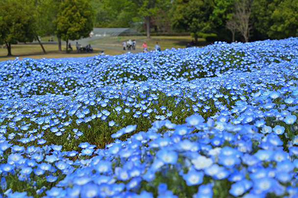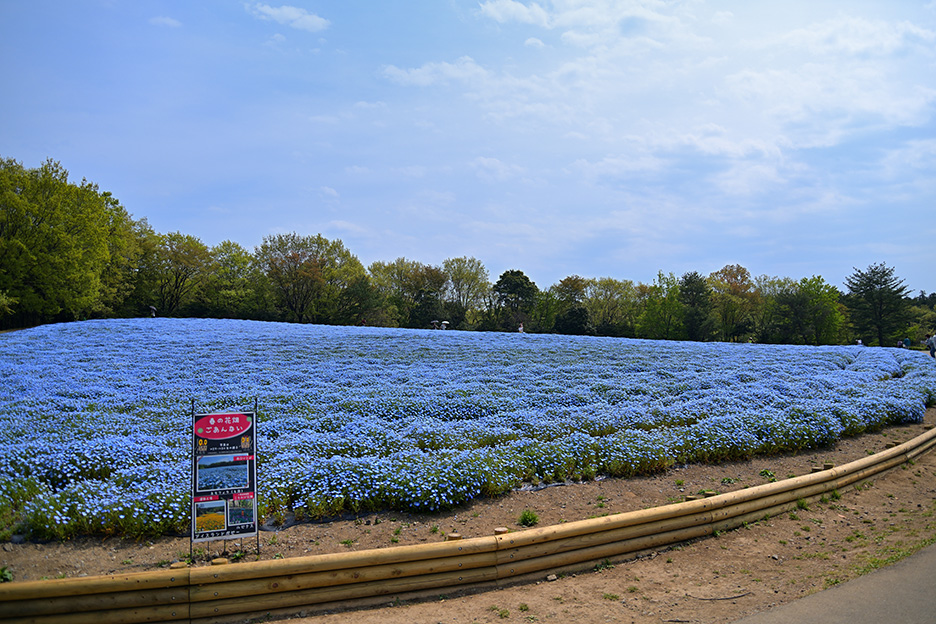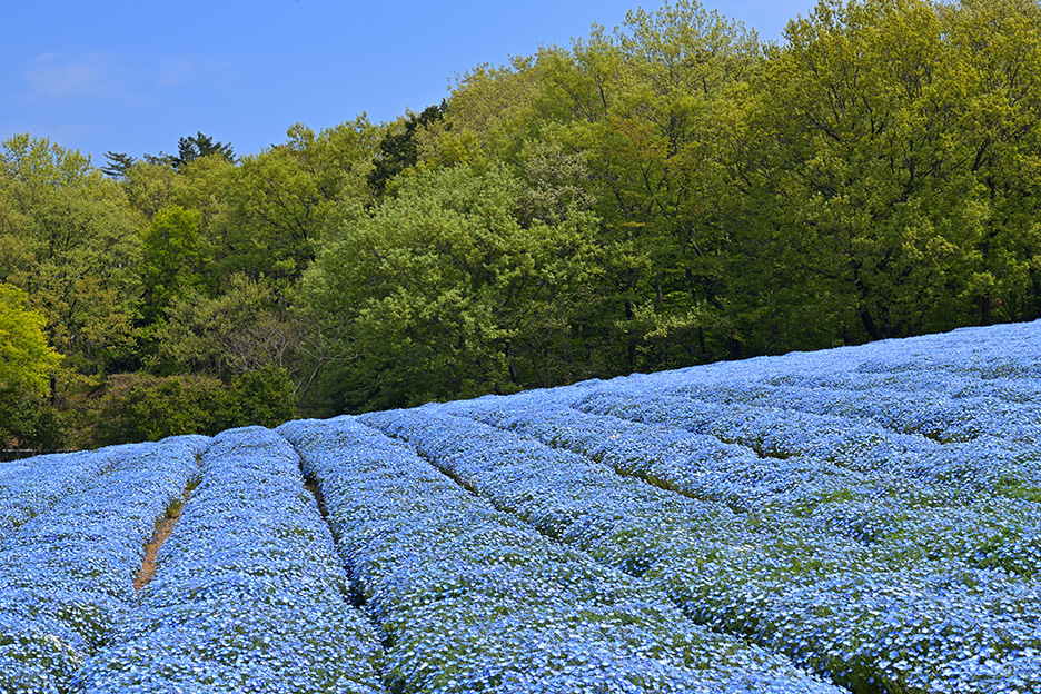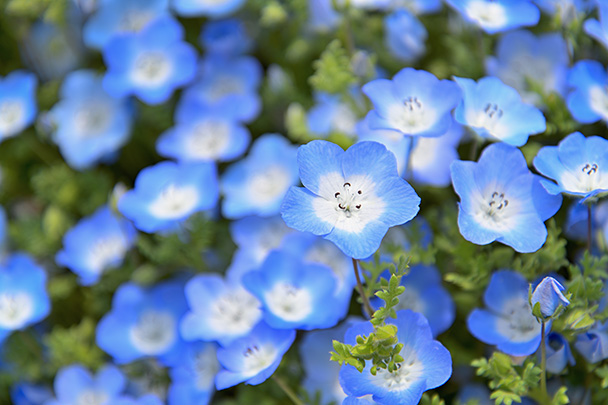小さくかわいらしい花をつけるネモフィラですが、淡い青色の絨毯が一面に広がるように群生する光景は圧巻の一言です。花畑全体を捉えるだけでなく、花に寄ったり背景を工夫したり、アイデア次第で撮りかたのバリエーションが増やせそうな被写体です。