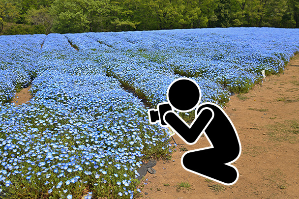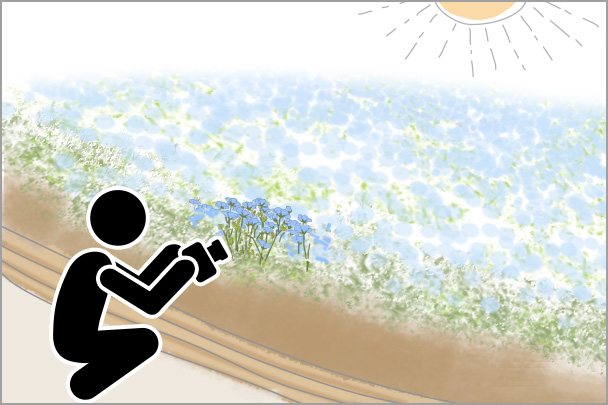 背丈が低く、群生していることの多いネモフィラを撮影するときは、花に近い低めのアングルから狙うとより花が密集しているように見え、花の独特な青色が引き立つのでおすすめです。花畑の傾斜や段差を利用するなどの工夫をしながら撮影してみてください。チルトやバリアングルモニターのあるカメラがあるとより撮影しやすいでしょう。また、バリアングルを使うことで、背の低い花でもより近寄ることができるため、花のアップや花が密集しているシーンも楽に撮影することができます。