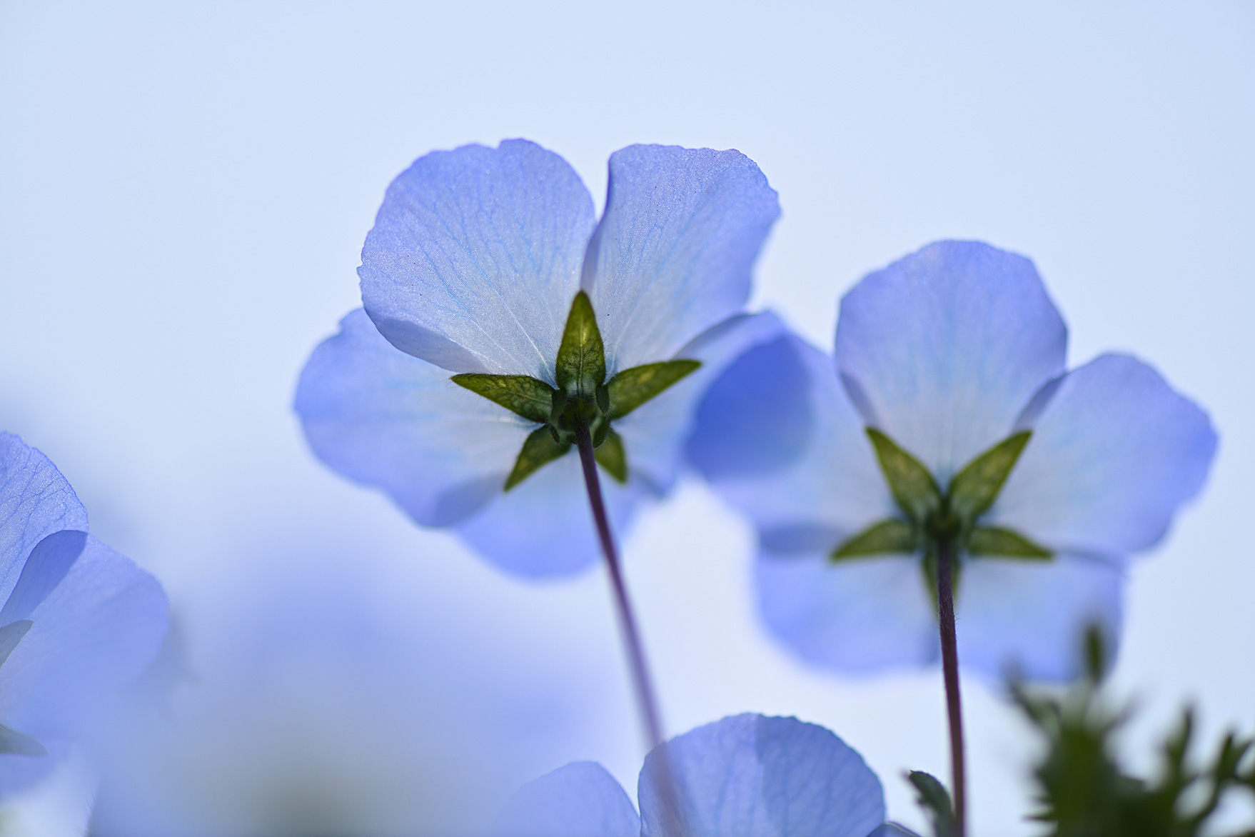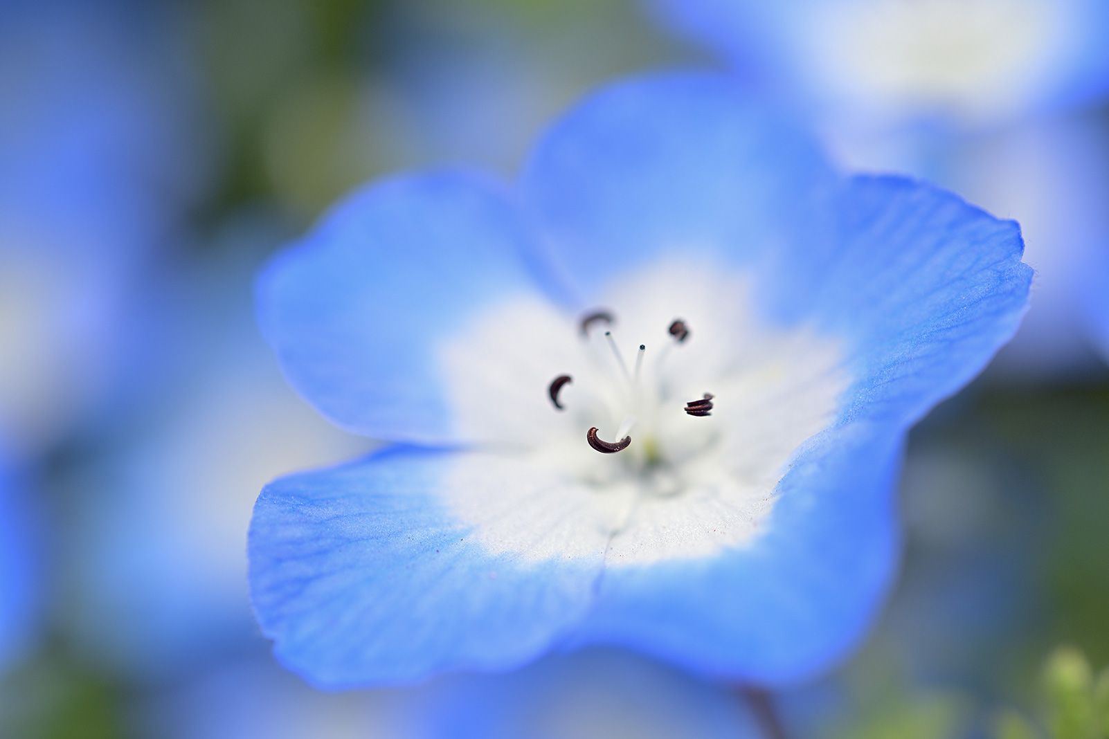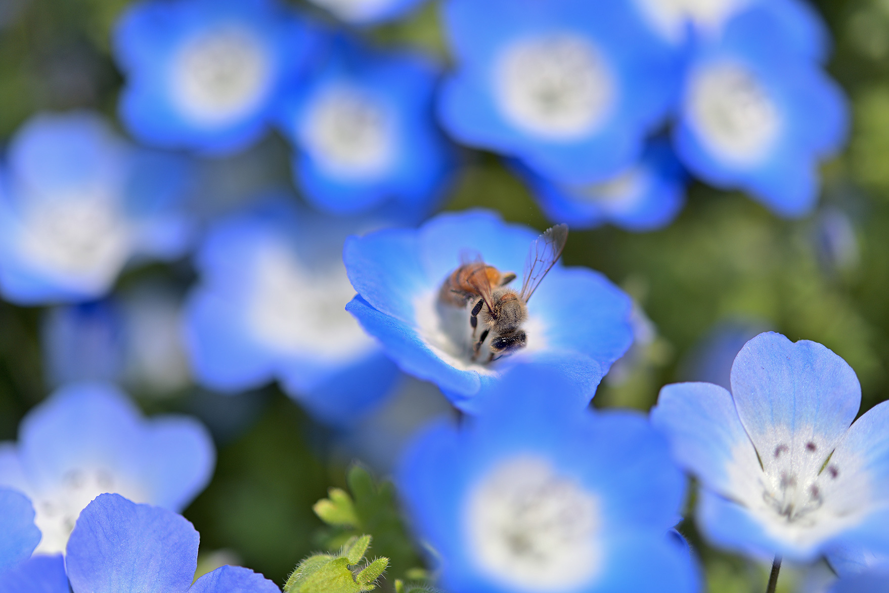シャッタースピードを稼いで手ブレを防ぐためにも、マイクロレンズでのクローズアップ撮影は晴れた日がおすすめ。青空をバックにしたネモフィラは格別の美しさです。