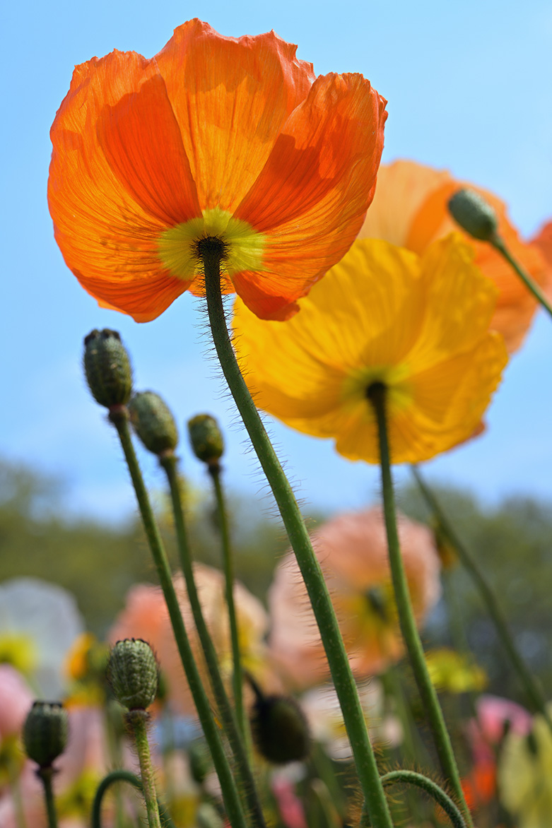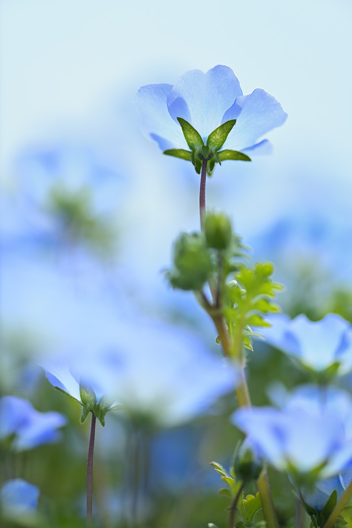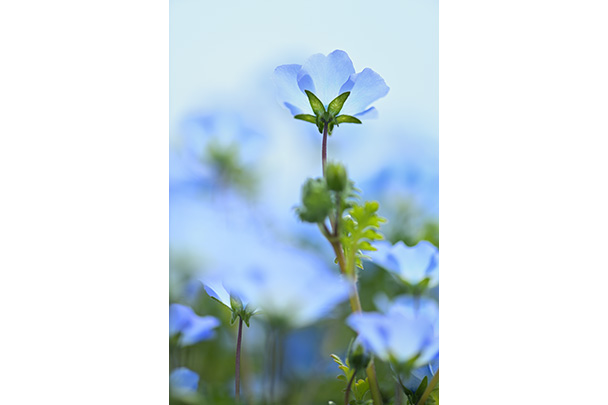 こちらはネモフィラ畑の段差を利用し、段の下から105mmで見上げるように撮影しています。ピントを合わせている花に近づいて撮影しているため、背景だけでなく手前に写っている花も大きくボケました。逆光で花の色は淡く写り、大きなボケと相まってどこかはかなげで幻想的な印象の1枚になりました。