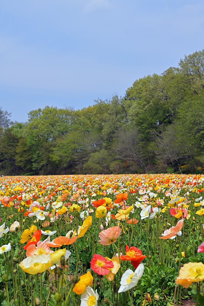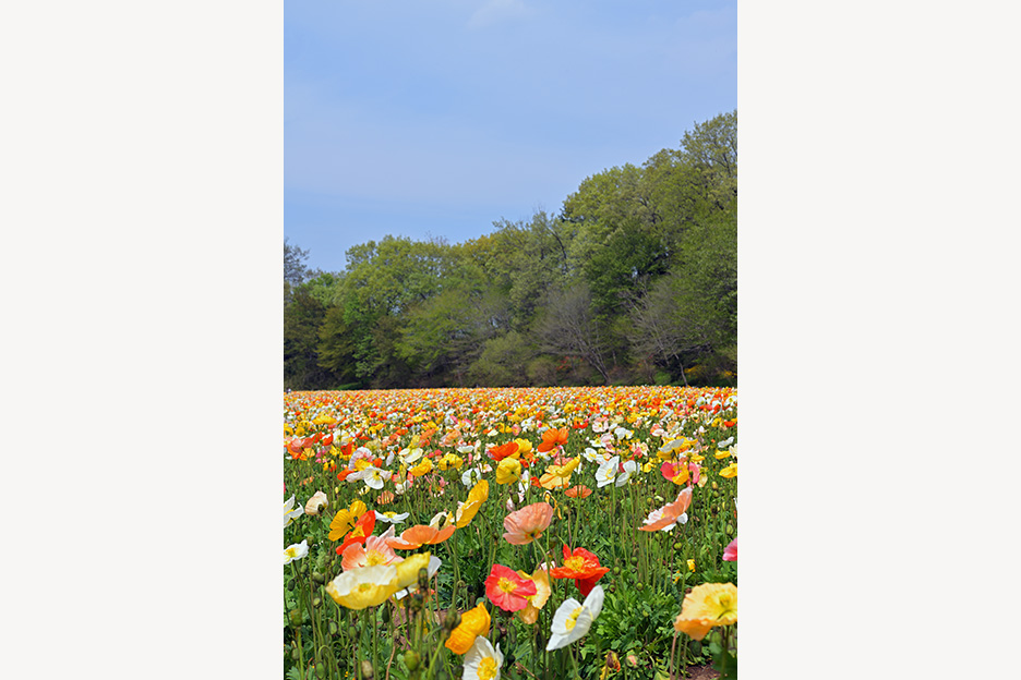 畝が連なるように植えられた花畑、間の土が写ってしまうとまばらな印象になってしまうため、カメラアングルは花の高さに近づくように低めに構えています。望遠画角の圧縮効果により標準画角で撮影したものよりギュッと花が密集し、手前や奥もふんわりとボケたきらびやかな印象の1枚になりました。