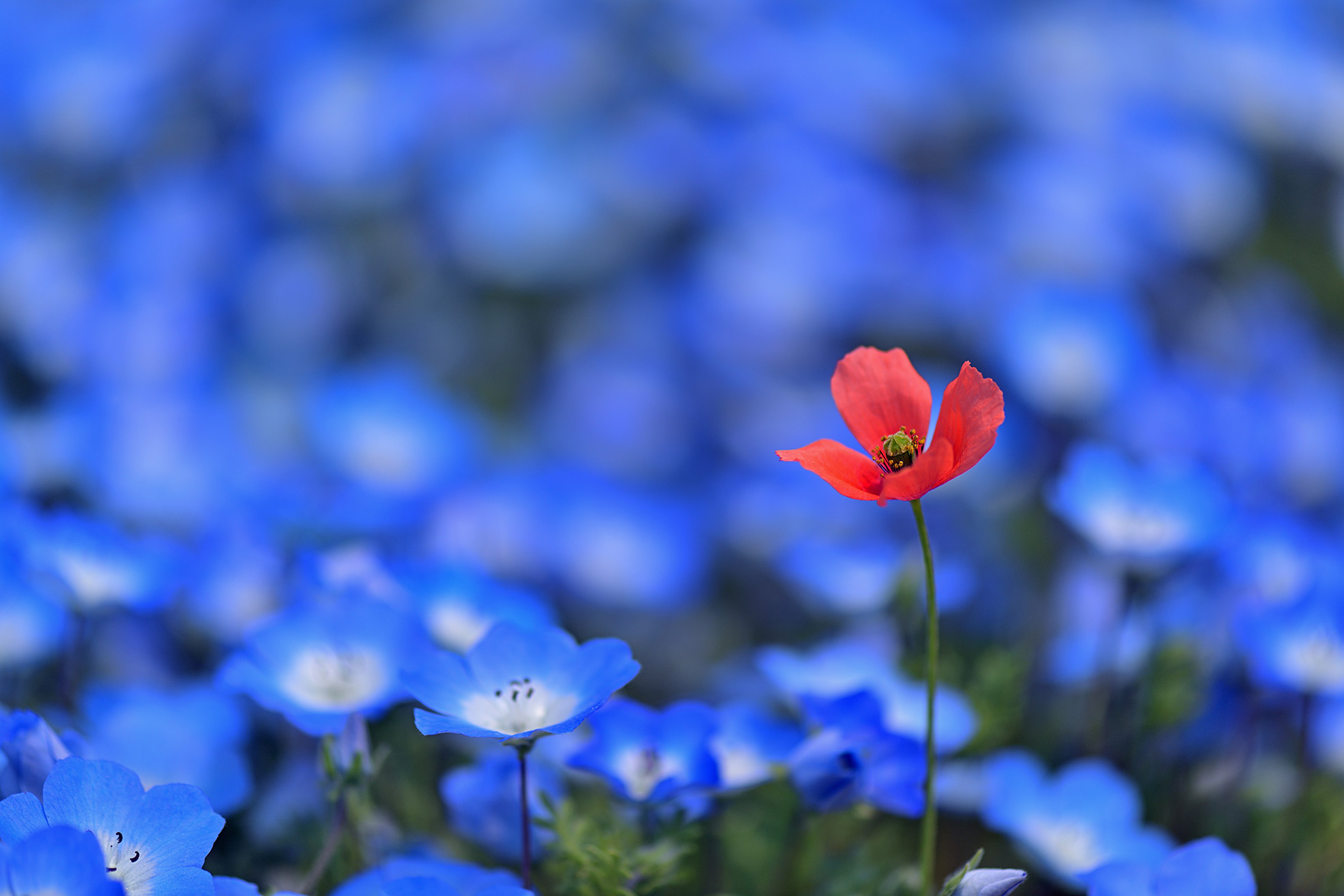 クローズアップ撮影だけでなく、描写力の高い単焦点レンズとしても楽しむことができるマイクロレンズ。105mmの焦点距離を活かしてネモフィラ畑の一部分を切り取りました。