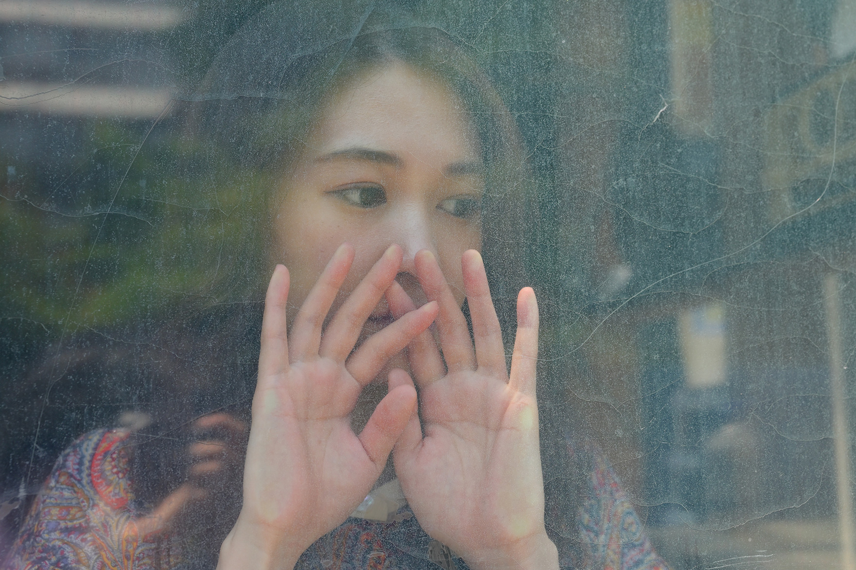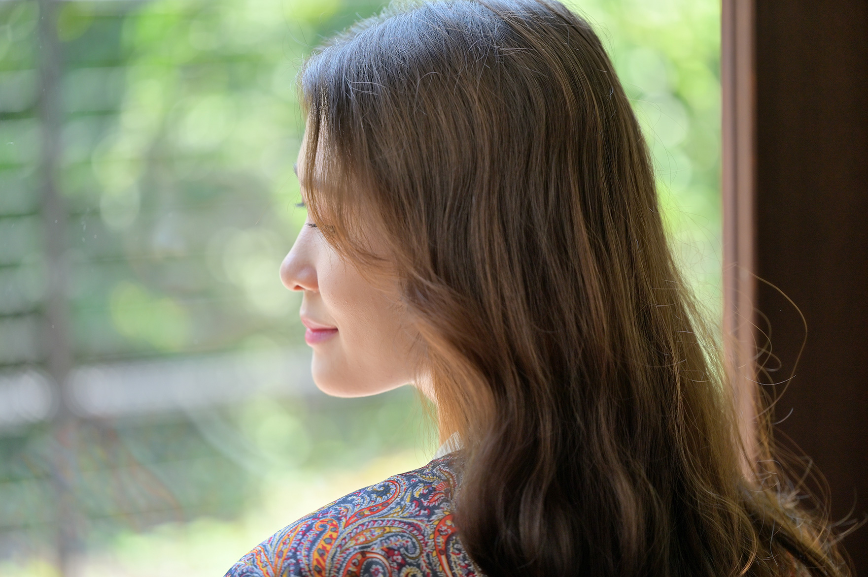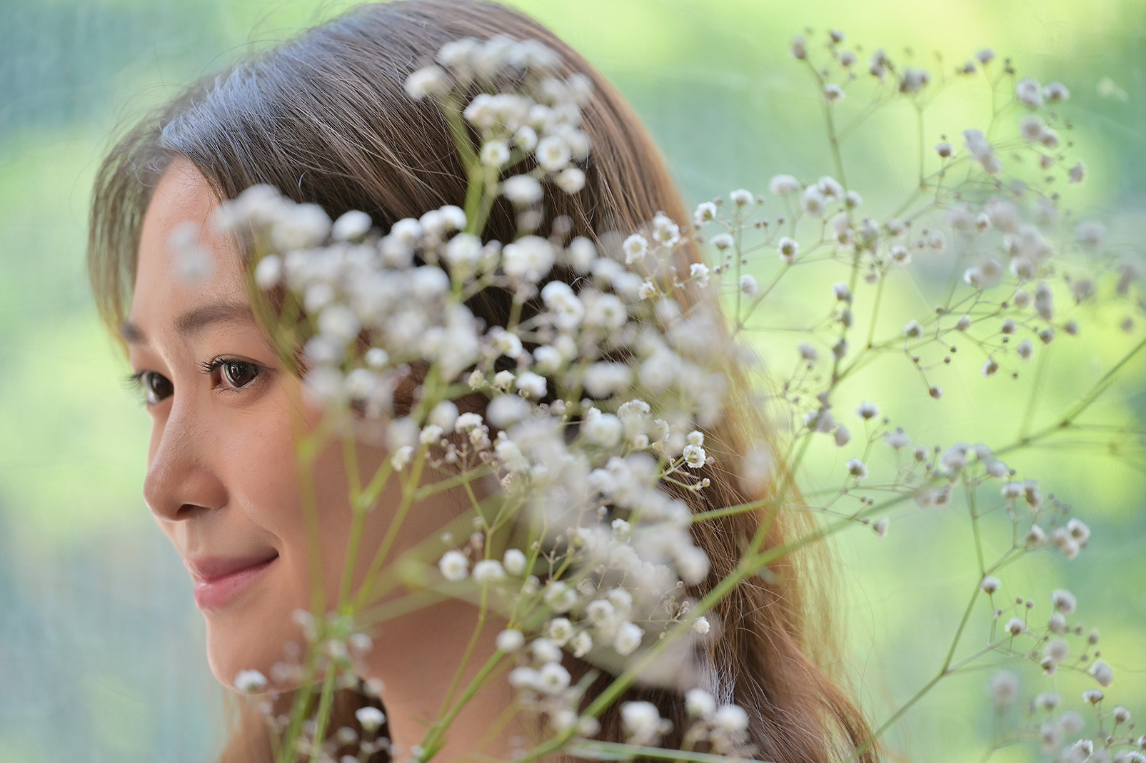 窓を背景に横向きに立ってもらい、小道具として用意したかすみ草をレンズの前に入れて撮影しました。105mmのレンズで絞りをf/3まで開き、手前のかすみ草と背景を大きくボカしています。やわらかく美しいボケと対比してピントの合ったモデルにパッと目が行きます。背景となった大きな窓の向こうには草木が茂っており、大きくボケたことでグリーンが美しいグラデーションとなり写真をより幻想的にしています。