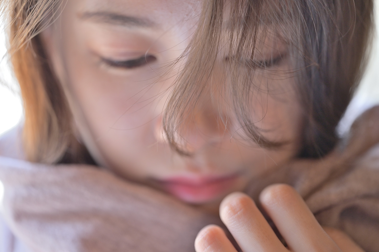 顔を正面からアップでフレーミング、あえて目ではなく顔の前に落ちた髪の毛にピントを合わせて撮った1枚です。絞りをf/3.2まで開き、さらに撮影距離が短くなるほど被写界深度が浅くなるのを利用してほんの一部分のみピントを合わせています。あわい斜光に照らされた髪の毛のやわらかな質感や毛の流れなど、1本1本の毛を繊細に捉えたレンズの解像感がよく伝わります。105mmのレンズを使っていますので、モデルとの距離感も近づきすぎることなく撮影できました。