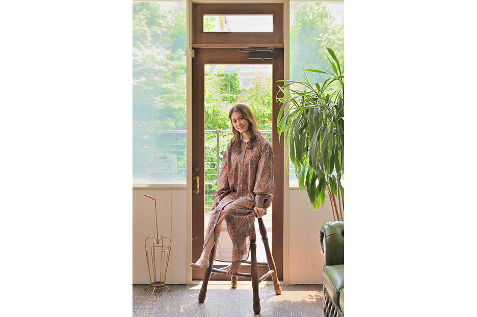 窓ガラスを背に座ってもらったモデルを、50mmのレンズで室内の雰囲気を入れ込みながら引きで撮影しました。逆光ですので「アクティブ D- ライティング」は強めに、晴れていたため窓の外が白飛びしすぎないよう-0.7露出補正をかけています。絞りをf/8まで絞ったことでモデルの衣装の柄から床板の模様など細かい部分までしっかり描写されているのがわかります。