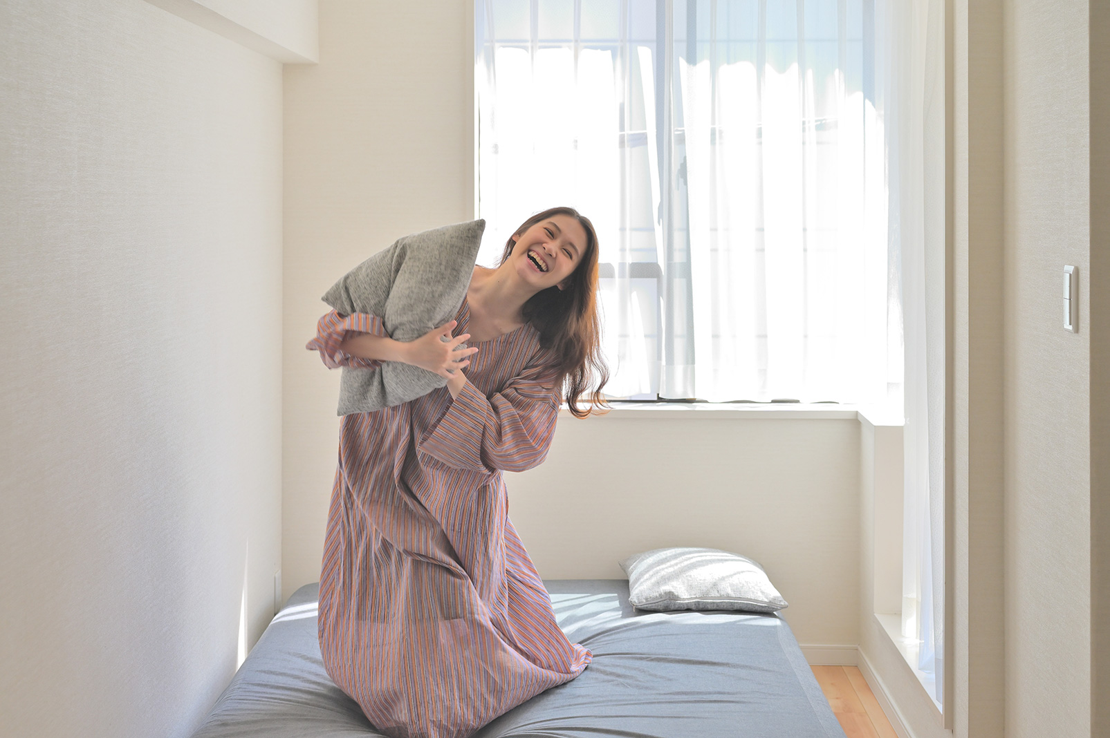 モデルの自然な笑顔を引き出すアイデアとして、枕投げをしてもらい遊びながら撮影。キャッチする瞬間の心からの笑顔が印象的です。ベストショットを狙うために何度か投げてはキャッチを繰り返してもらい、連写撮影しました