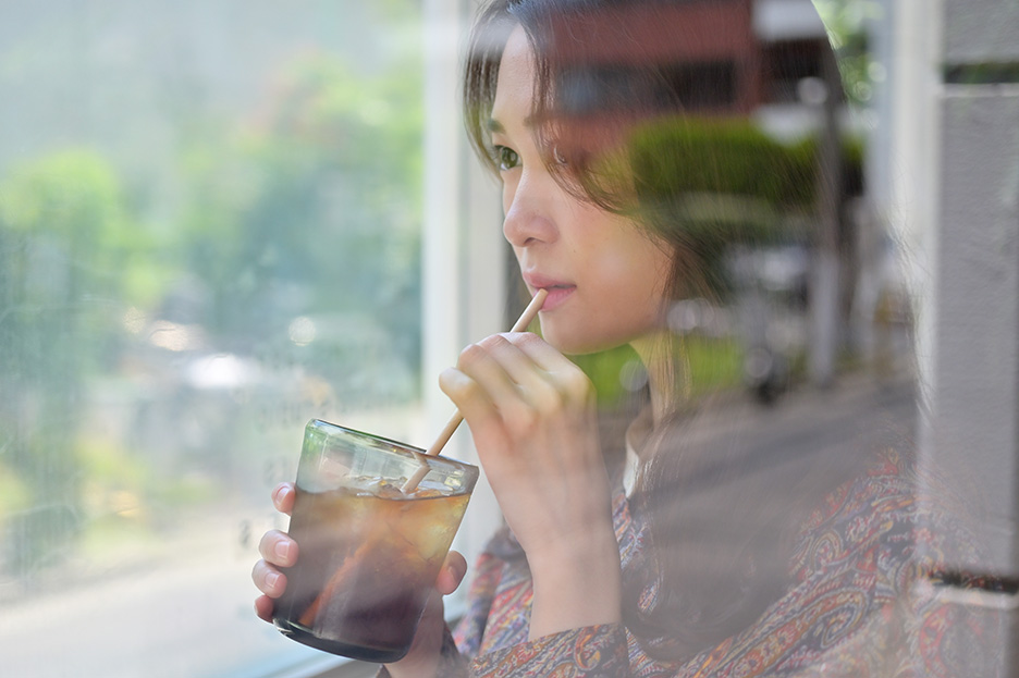 グラスはポートレート撮影でよく使われる小物ですが、ストローを挿すことで手の表情が増えポージングも決まりやすくなります。今回はさらに窓ごしに座ってもらい外から撮影し、カフェのイメージで雰囲気を出しました