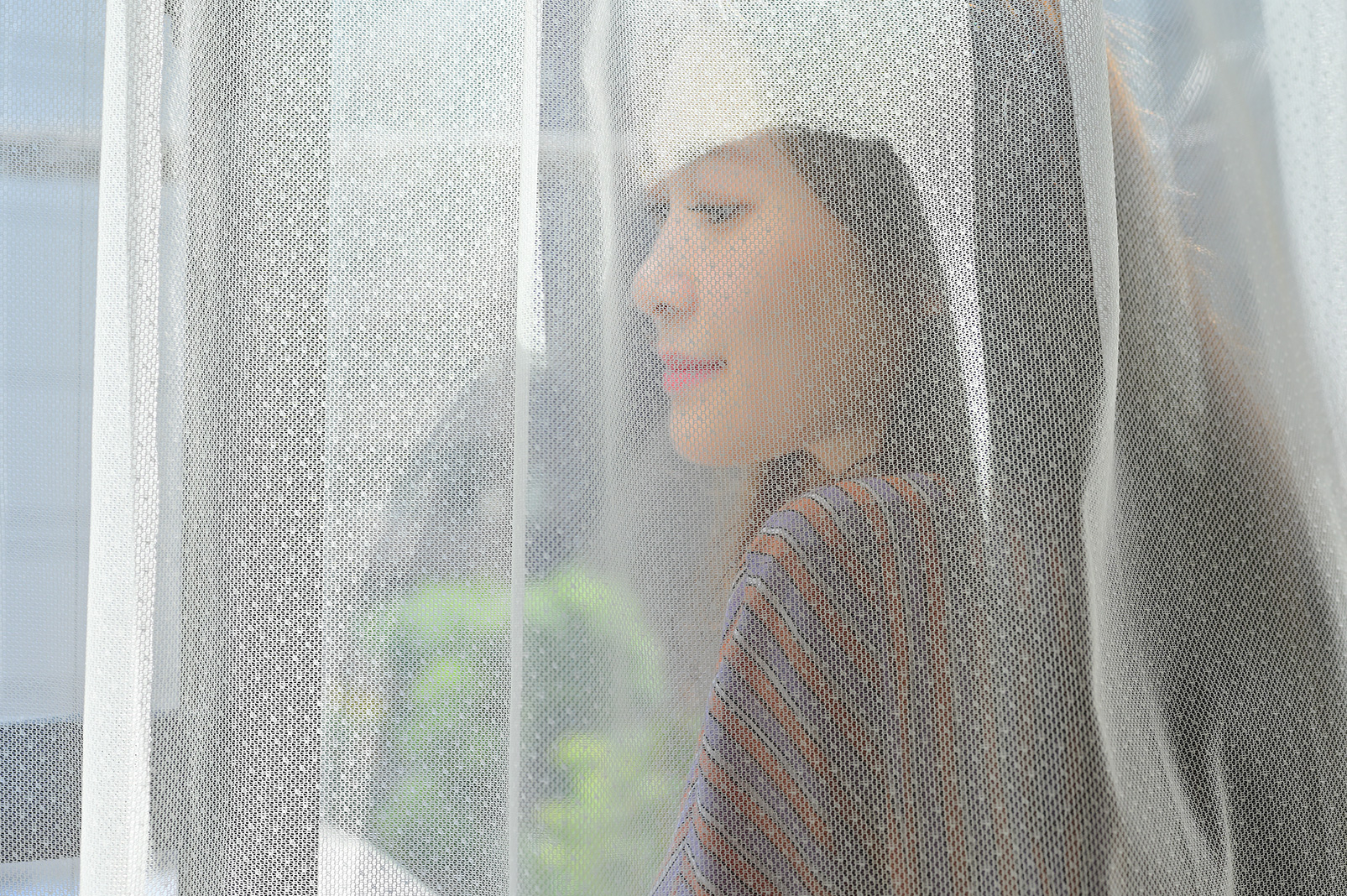 レースのカーテンの中に入ってもらい、逆光で撮影。レースから顔までピントが合うようコントロールし、レースの柄まで繊細に捉えています。ベールをかぶった花嫁のような優しい表情が印象的です