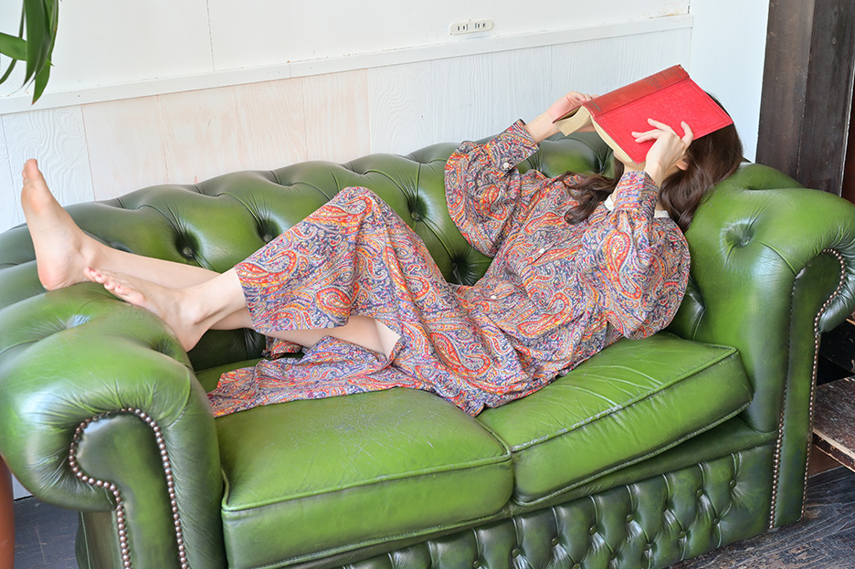 ソファの色と反対色の赤色の本を小物として準備。ゴロンと寝転がって本を持ってもらうことで雰囲気よく仕上げています。そしてあえて顔を隠しました。表情を見せない、変化球のポートレートです