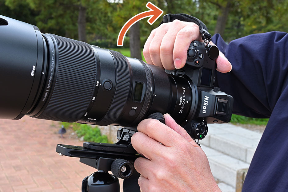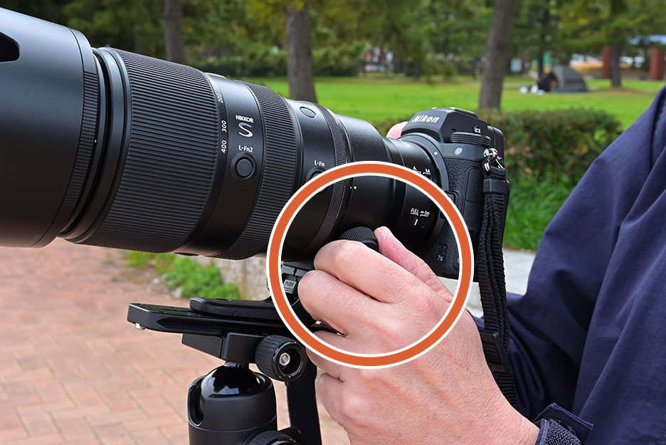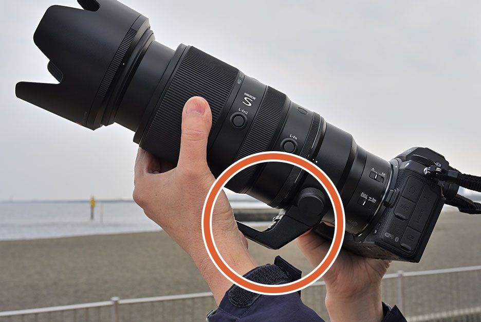 右手でカメラボディーを固定、左手のひらに三脚座をのせてレンズを安定させます。ズームレンズの場合、レンズを構えながら指先でズームリングを回すことができます