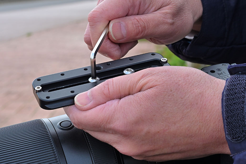 超望遠レンズ(三脚座の取り付け)に対応した、大きく丈夫なプレートを三脚座に装着します。レンズを落とさないように、安定した場所で行いましょう