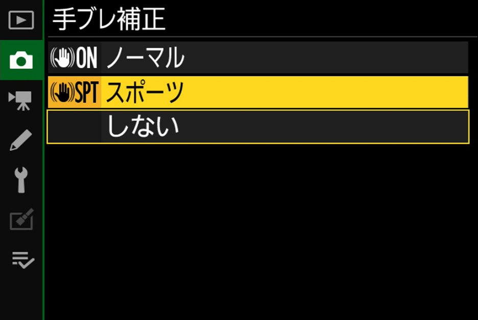 手ブレ補正機能には、[ノーマル]モードと[スポーツ]モードがあり、[ノーマル]は撮影者が静止している状態で、風景など動かない被写体を撮影する際に適しています。[スポーツ]は動いている被写体を追って連写するときなどに最適なモードです。