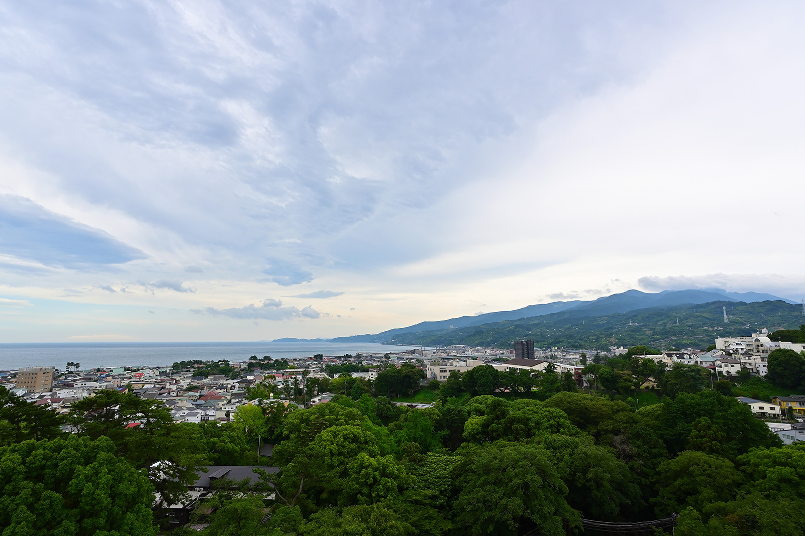 旅先の街一帯を見渡すことができる展望スポットから、風景を撮影しました。レンズの一番広角側、12mm(35mm判換算:18mm相当)での撮影、目の前に広がる景色をそのまま丸ごと映し込んだかのような写真を撮ることができます。手前の木々から街並み、遠くの海まで広角ならではの遠近感も感じる、ダイナミックな1枚です。