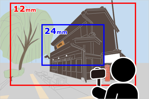 街中にある建物を撮影する際など、スナップ撮影では路上であまり引いて撮ることができないケースがあります。そんなとき、超広角の画角を持つレンズが大活躍。標準画角の24mm(35mm判換算:36mm相当)で撮影すると建物の一部分しか撮影することができませんが、12mm(35mm判換算:18mm相当)では建物全体だけでなく、周辺の雰囲気も映し込むことができました。