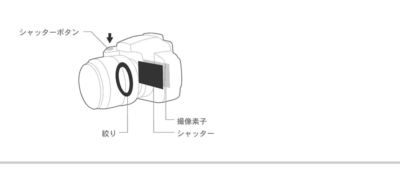 シャッタースピードを速くすると、シャッターが開いている時間が短くなるため、光が撮像素子に当たる時間が短くなります。