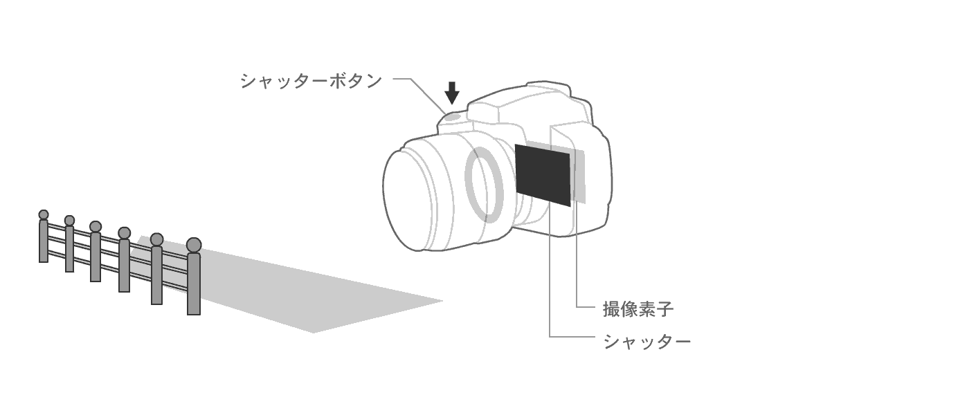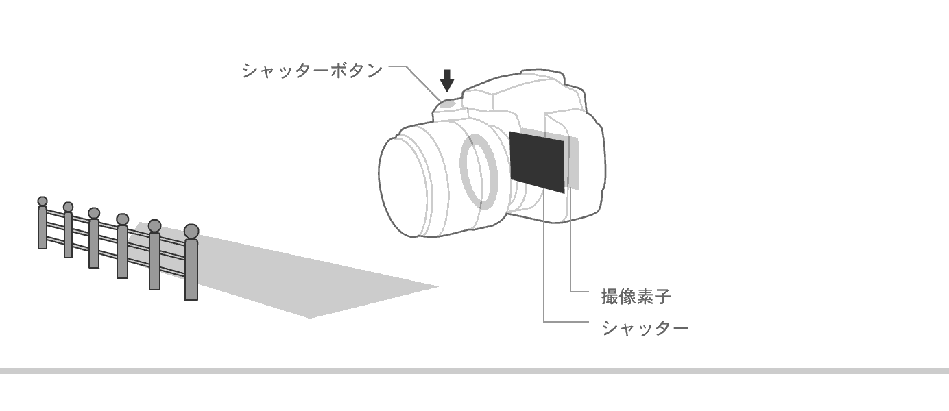 シャッタースピードを速くすると、光が撮像素子にあたる時間は短くなり、シャッタースピードを遅くすると、光が撮像素子にあたる時間は長くなります。