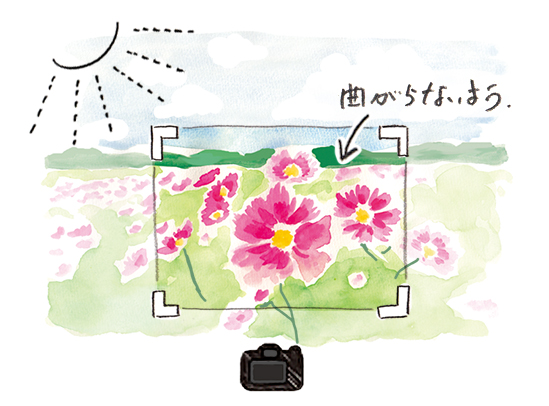 18mmという超広角レンズを選択し、思い切って主役の花に近付いています。カメラの高さを花の高さまで下げ、やや低い位置から見上げる感じで、背景の空と雲を入れました。山並みと空の境となる線が傾かないように注意が必要です。ほぼ順光の光(ややトップライトな状態)で、まんべんなく光が回るときを狙っています。