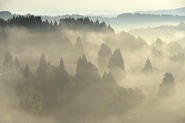 山峡に広がり始めた霧が、光が差し始めると少しずつ動き出します。赤みがかった光の微妙な色の変化のなか、杉木立のシルエットがいいアクセントになってくれました。