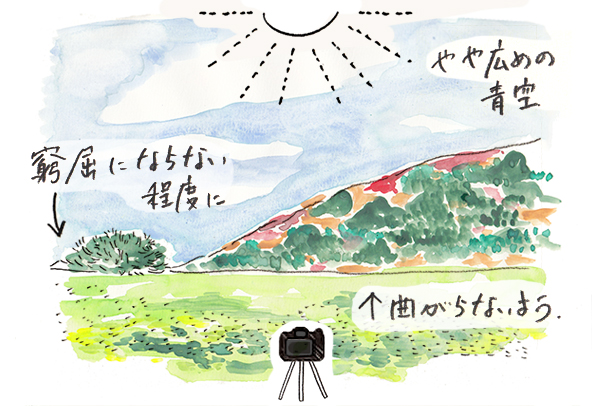 - 青空と白い雲を強調する切り取り方と、円偏光フィルターを使ってコントラストをつけた